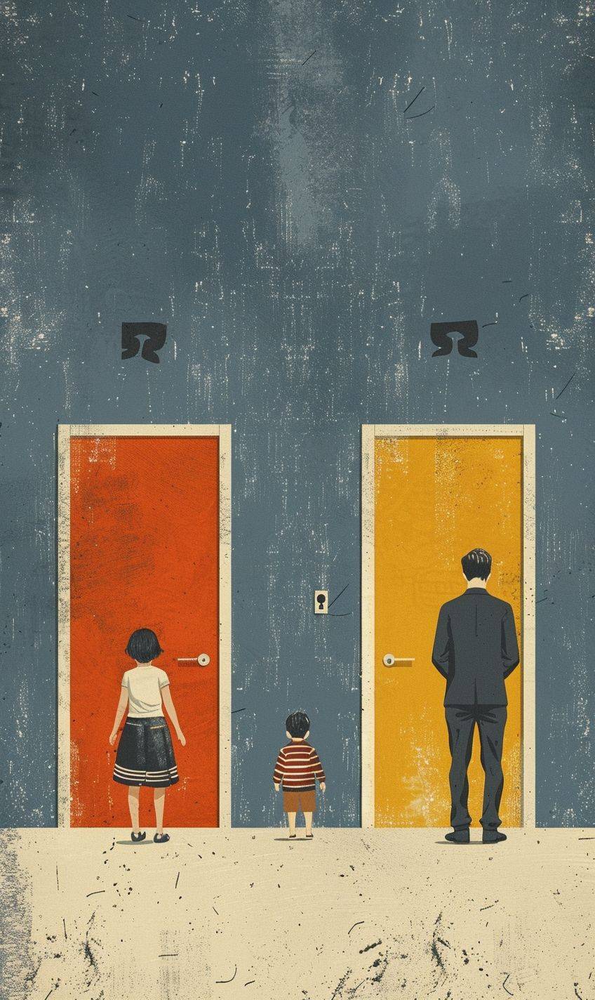 Parents divorced, father and mother walked out from two doors respectively, leaving the child alone, simplicity, simple colors, sense of space depth, graphic design