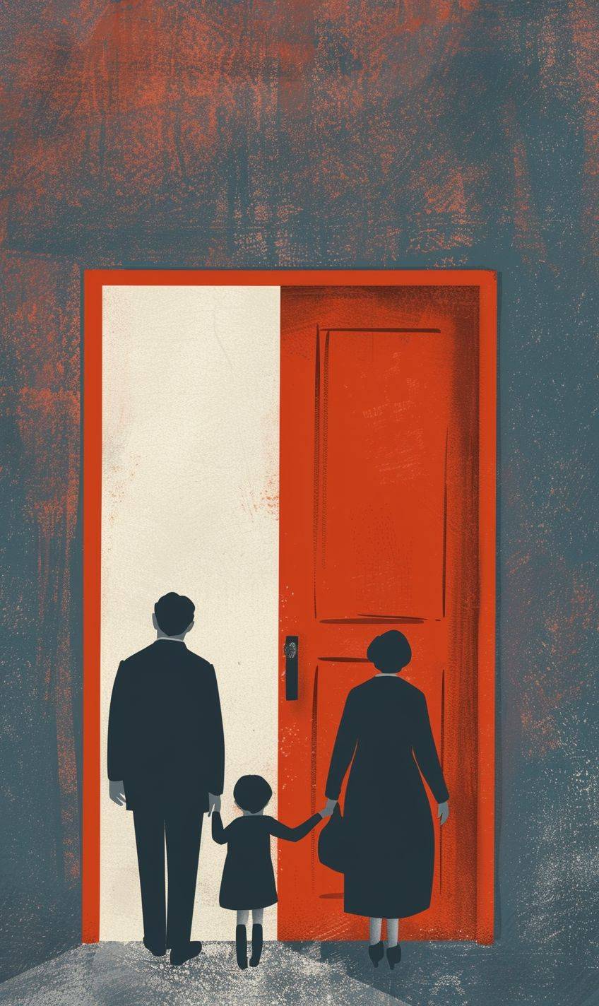 Parents divorced, walking out from two doors, leaving the child alone; simplicity in design, simple colors, and a sense of spatial depth.