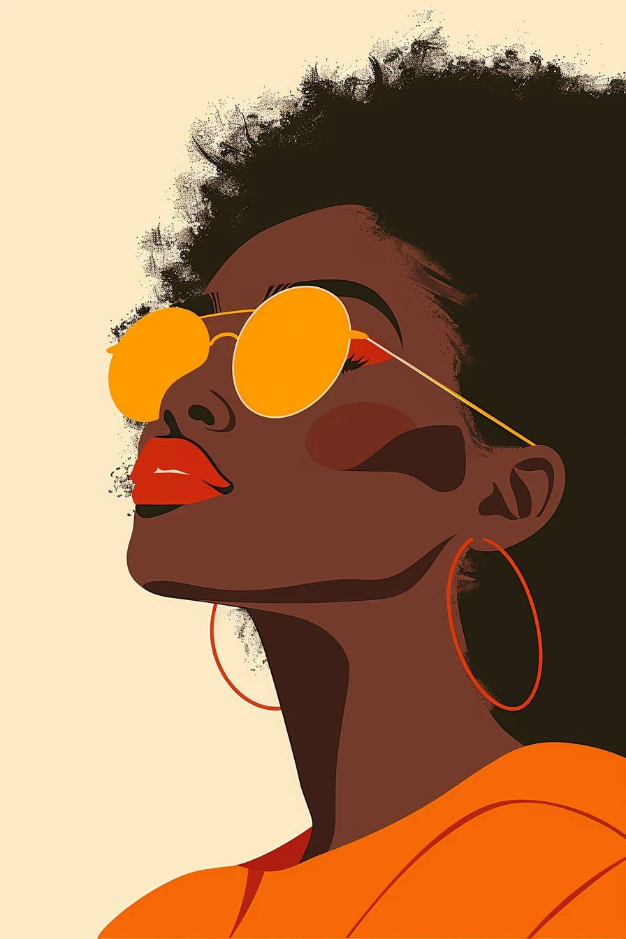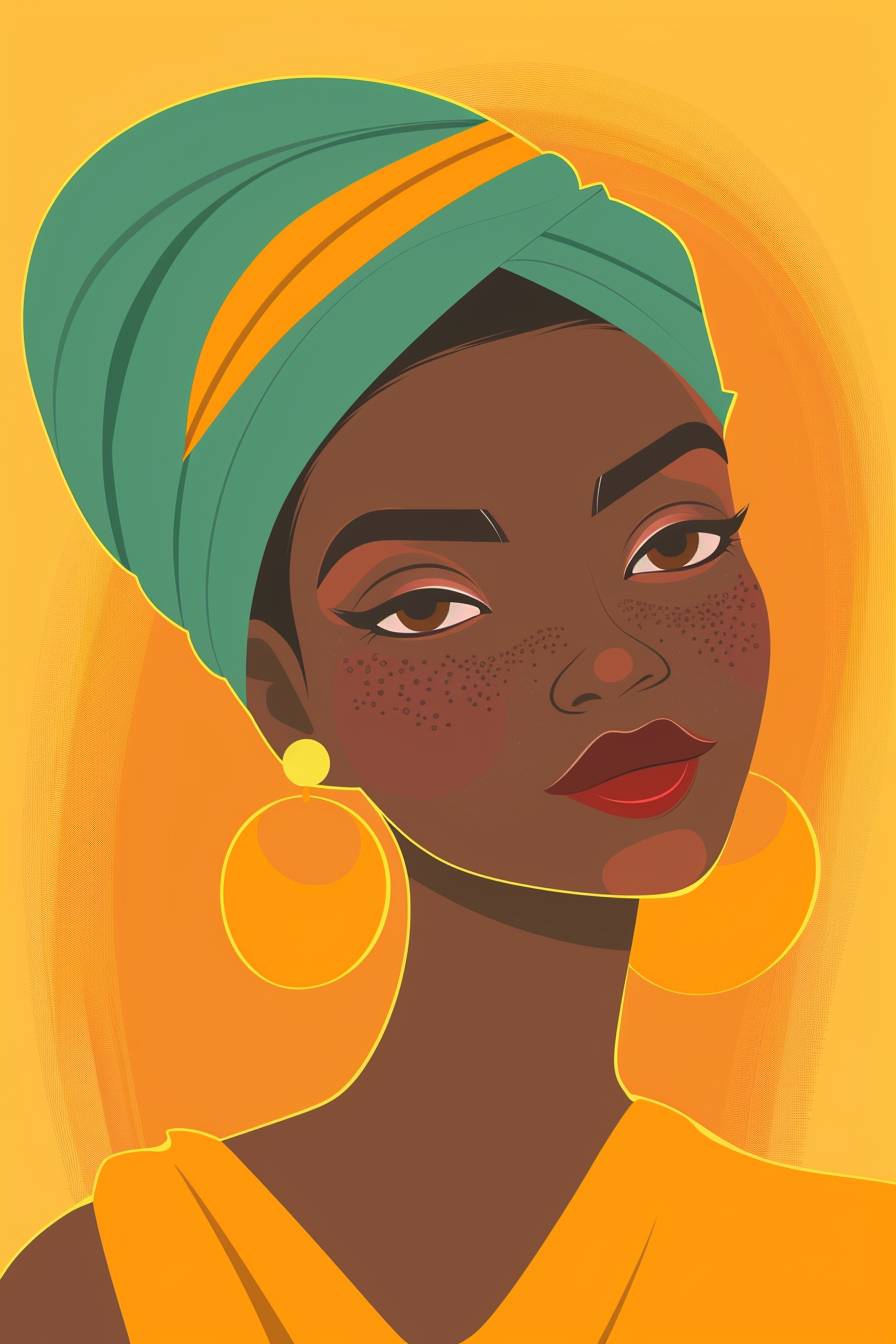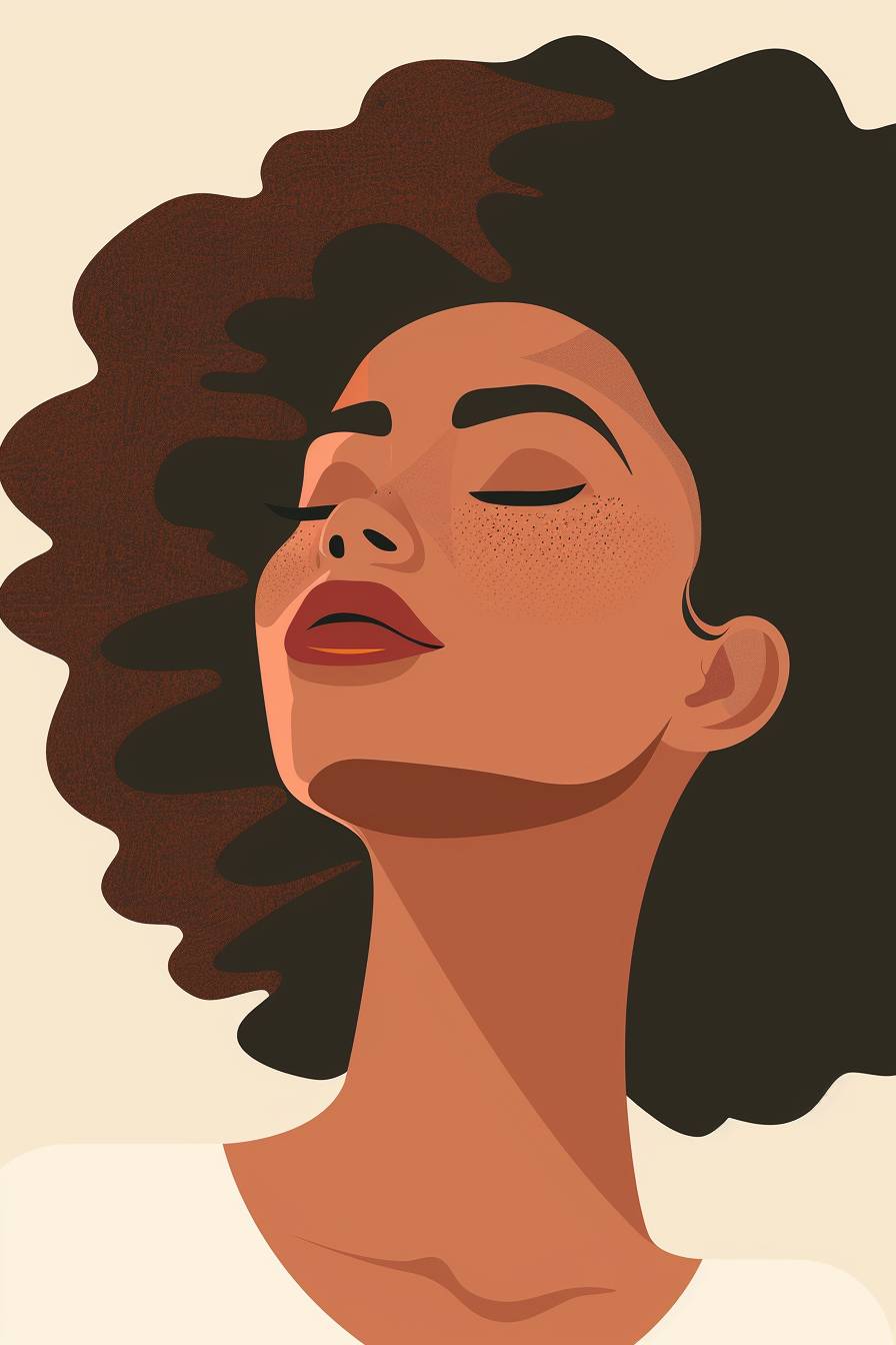 happy peaceful dark brown skinned woman, eyes open average size, stylish, light bright colors, graphic art, vector, flat design, --ar 2:3 --v 6.0