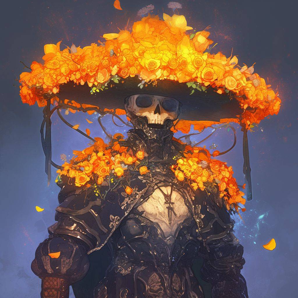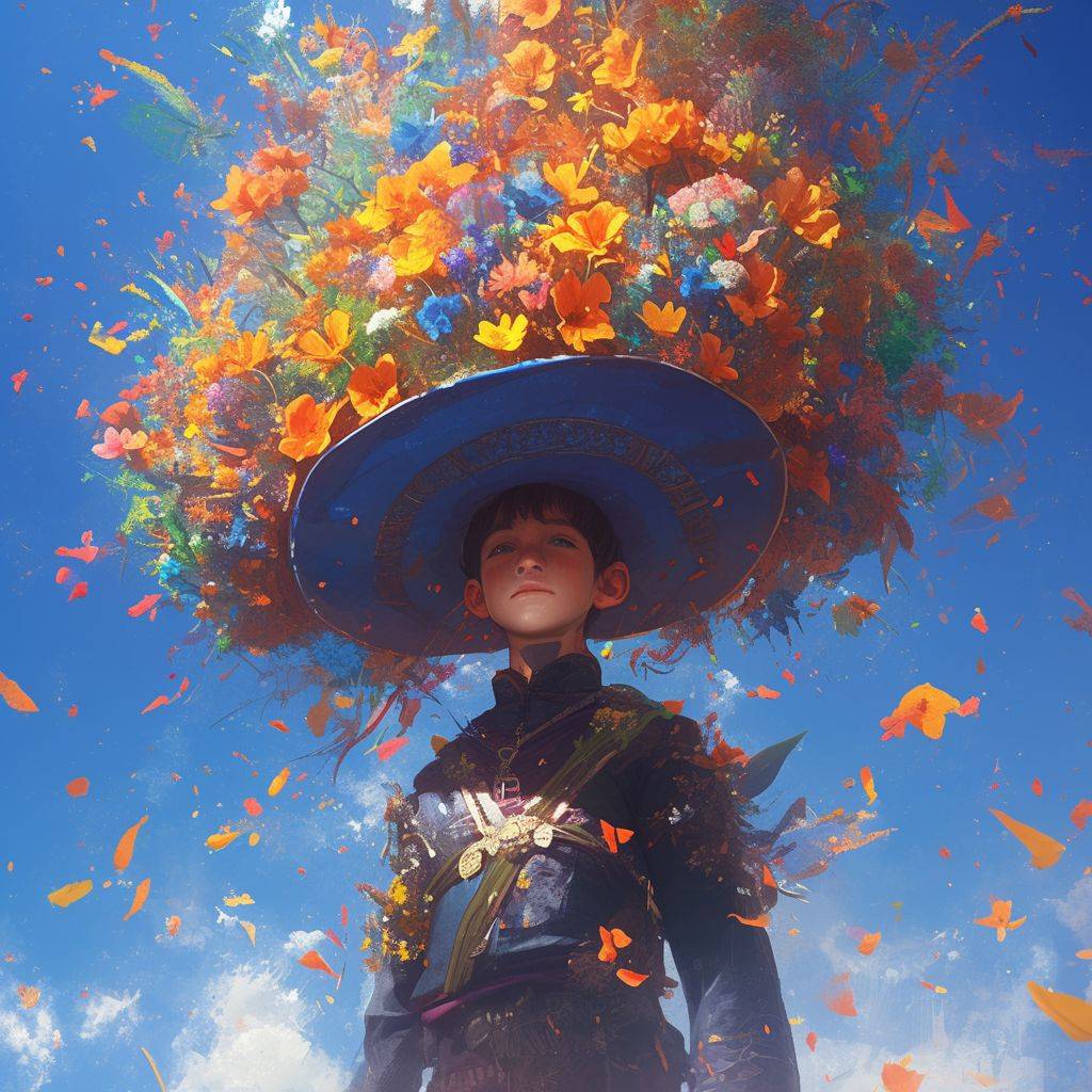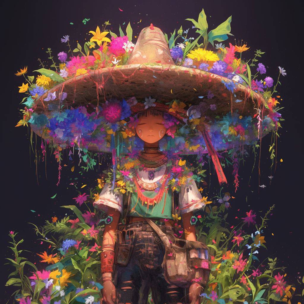 a [SUBJECT] in a large sombrero, in the style of meticulous realism, 2d game art, made of flowers, vibrant realism, zbrush, grim realism, colorful realism --niji 6