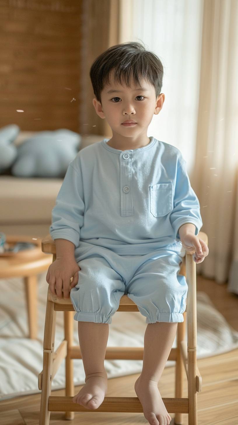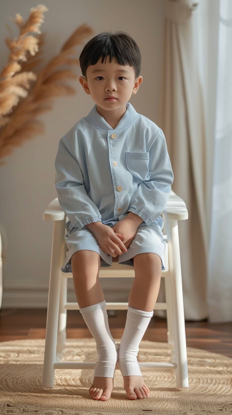 A cute 9-year-old Chinese boy in light blue clothes and shorts sitting on a high chair, high stool, barefoot. Feet do not touch the ground, facing the camera, legs closed, beige carpet and wooden floor in the background. Soft light indoors, bright lighting. Ultra HD, ultra realistic, photography lighting, 4k --ar 9:16 --v 6.0