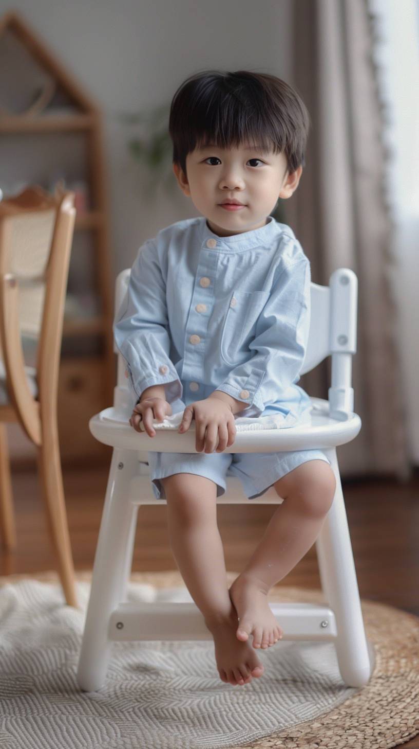 A cute 9-year-old Chinese boy in light blue clothes and shorts sitting on a high chair, barefoot. His feet do not touch the ground, facing the camera, legs closed, with a beige carpet and wooden floor in the background. Soft indoor light, bright lighting. Ultra HD, ultra realistic, photography lighting, 4k