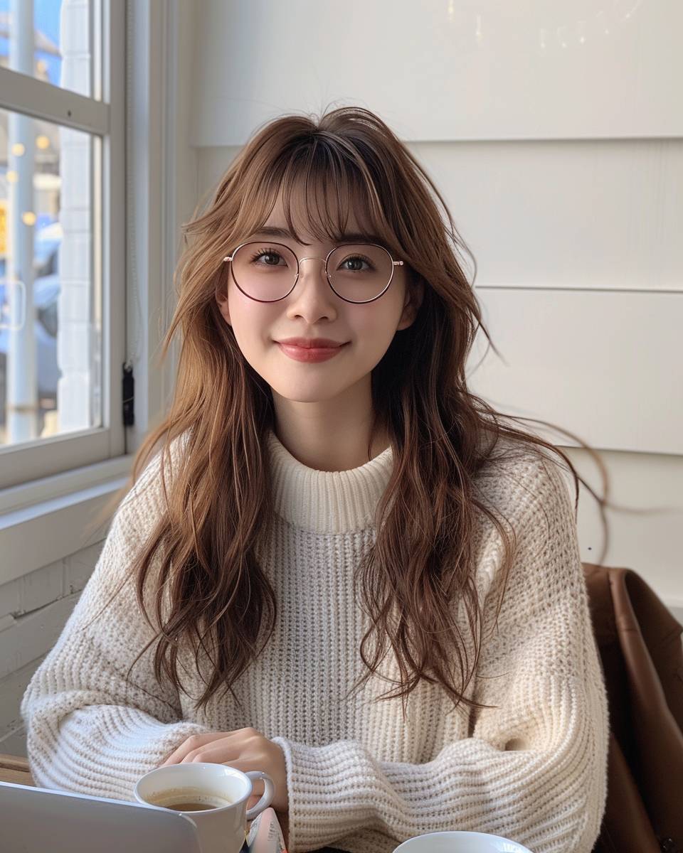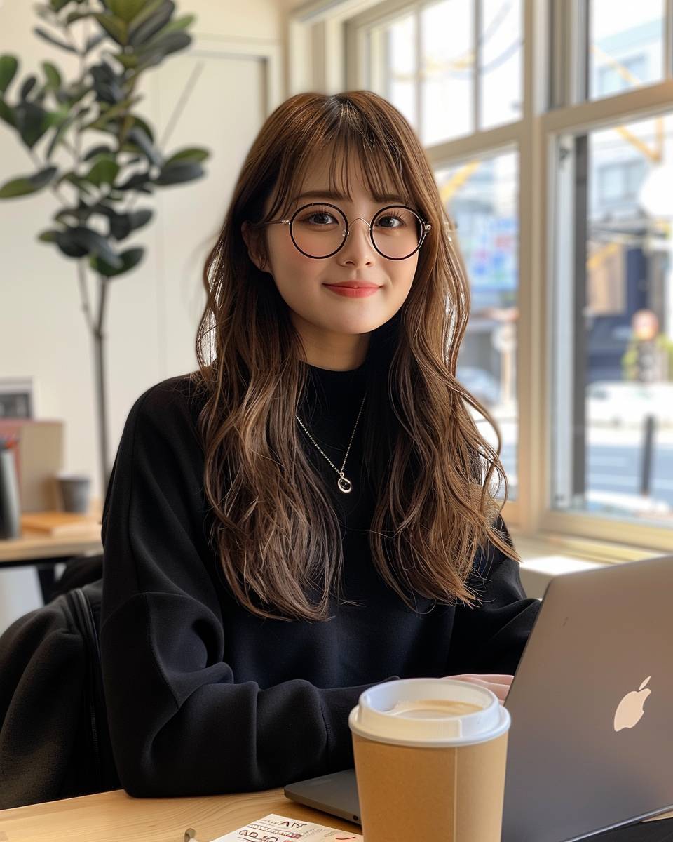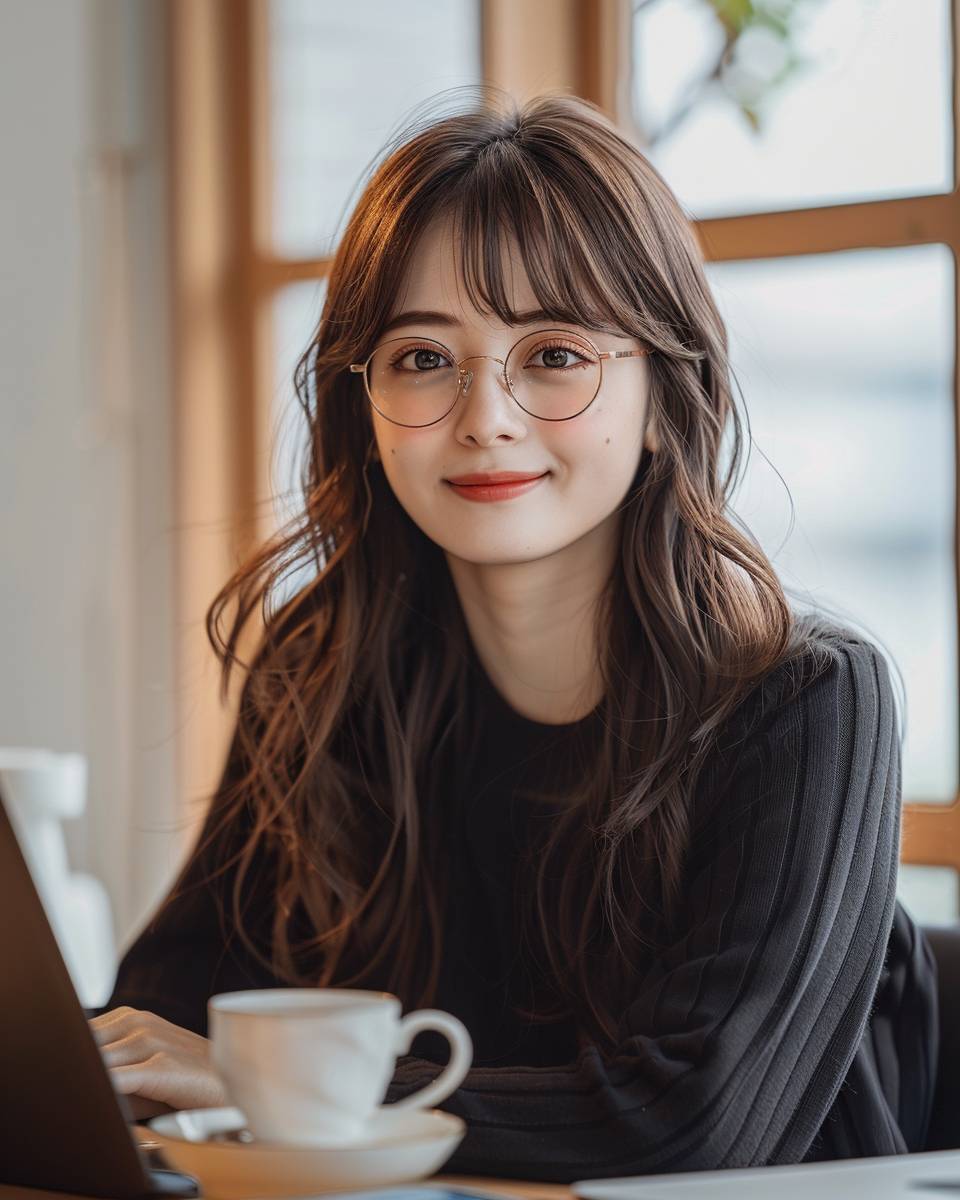A cute Japanese girl with glasses is sitting at her desk, smiling and looking straight ahead. She has long brown hair and bangs that frame the eyes of an adorable face. On one side there's a laptop open on social media while she takes a break from work to have some coffee or tea in front of it. The photo was taken in the style of a camera phone and posted as profile picture on Instagram. There should be no text written over it. In the background you can see white walls, a window behind her and sunlight streaming through. --ar 71:89 --stylize 250 --v 6.0