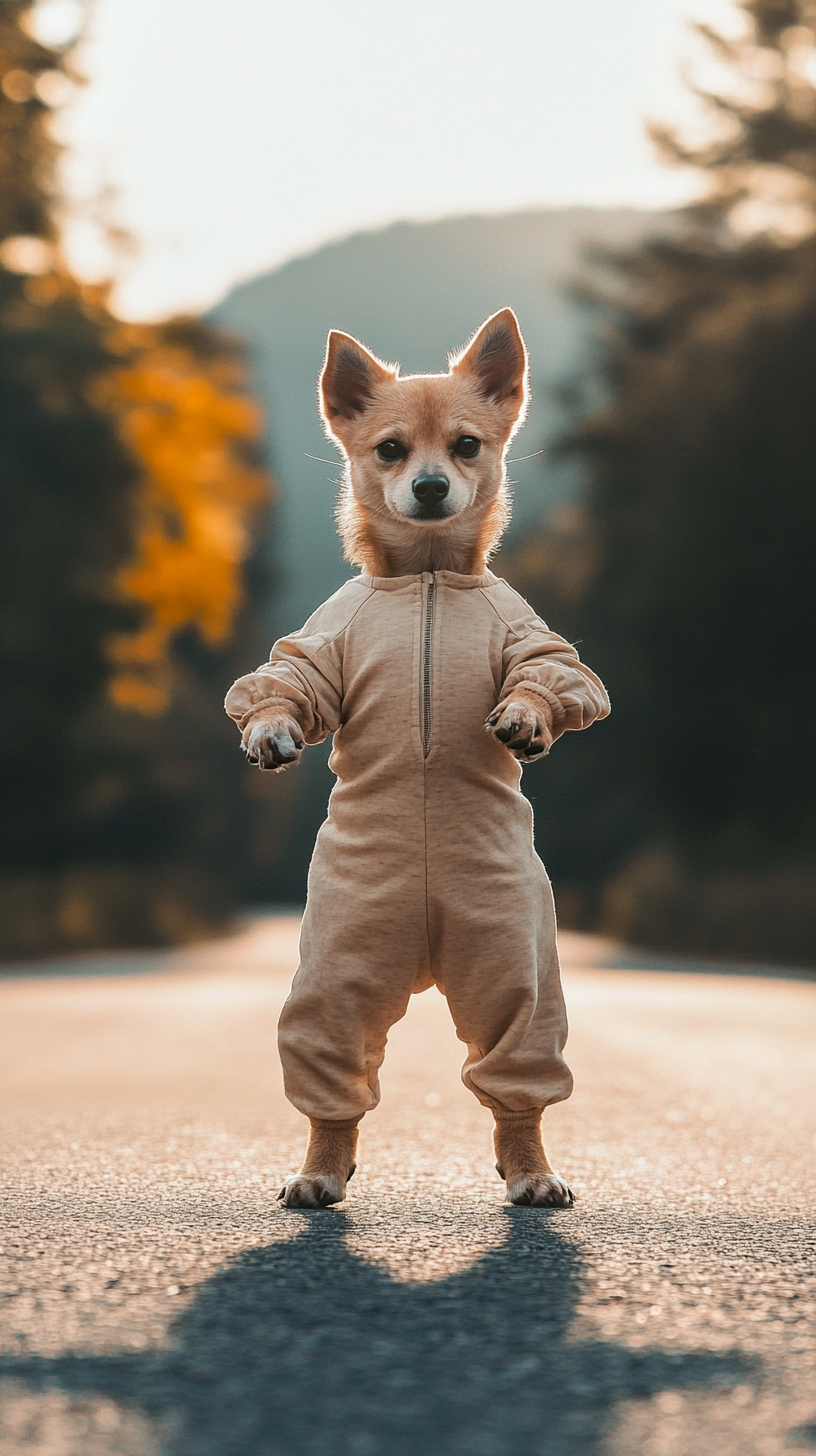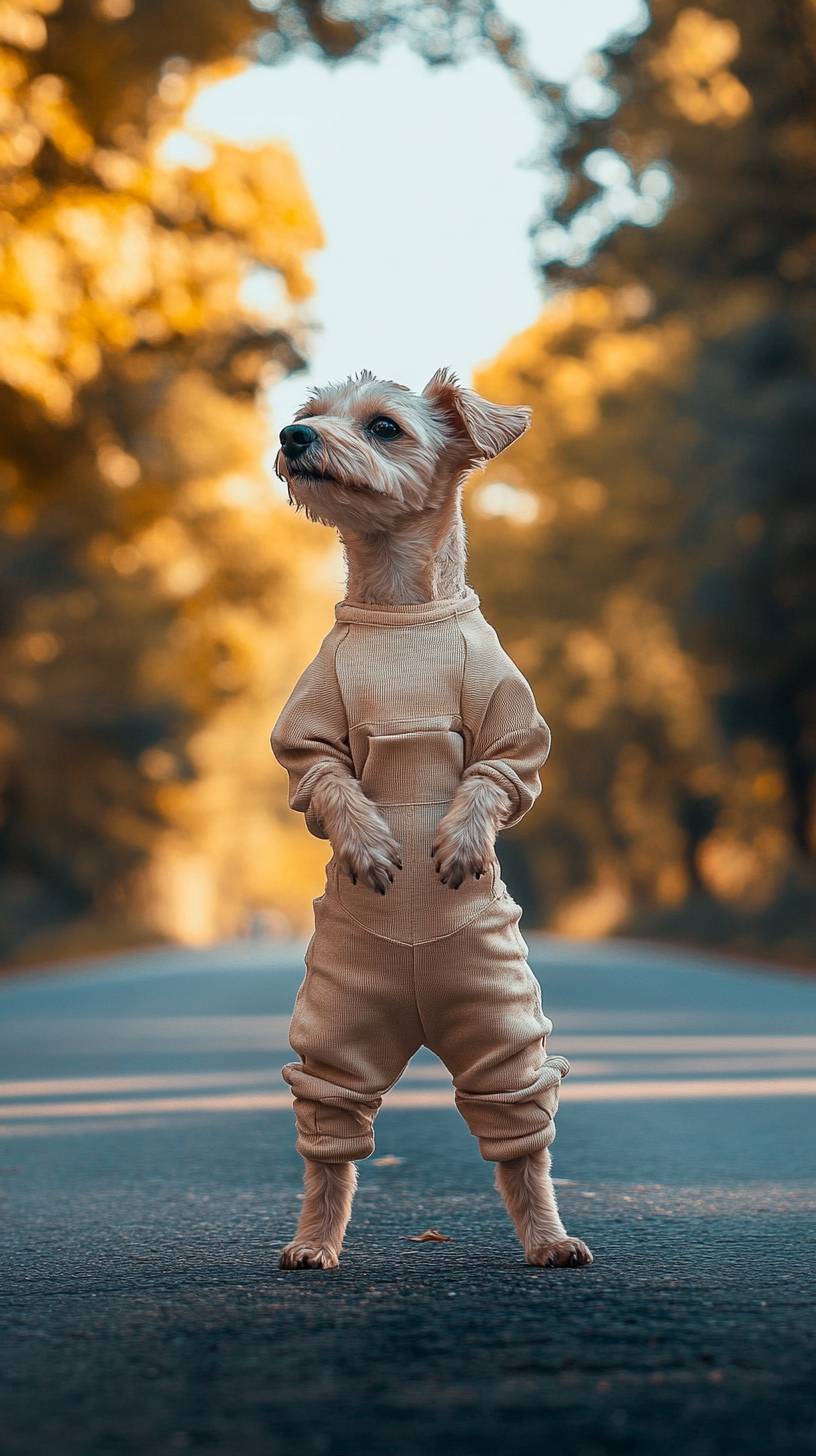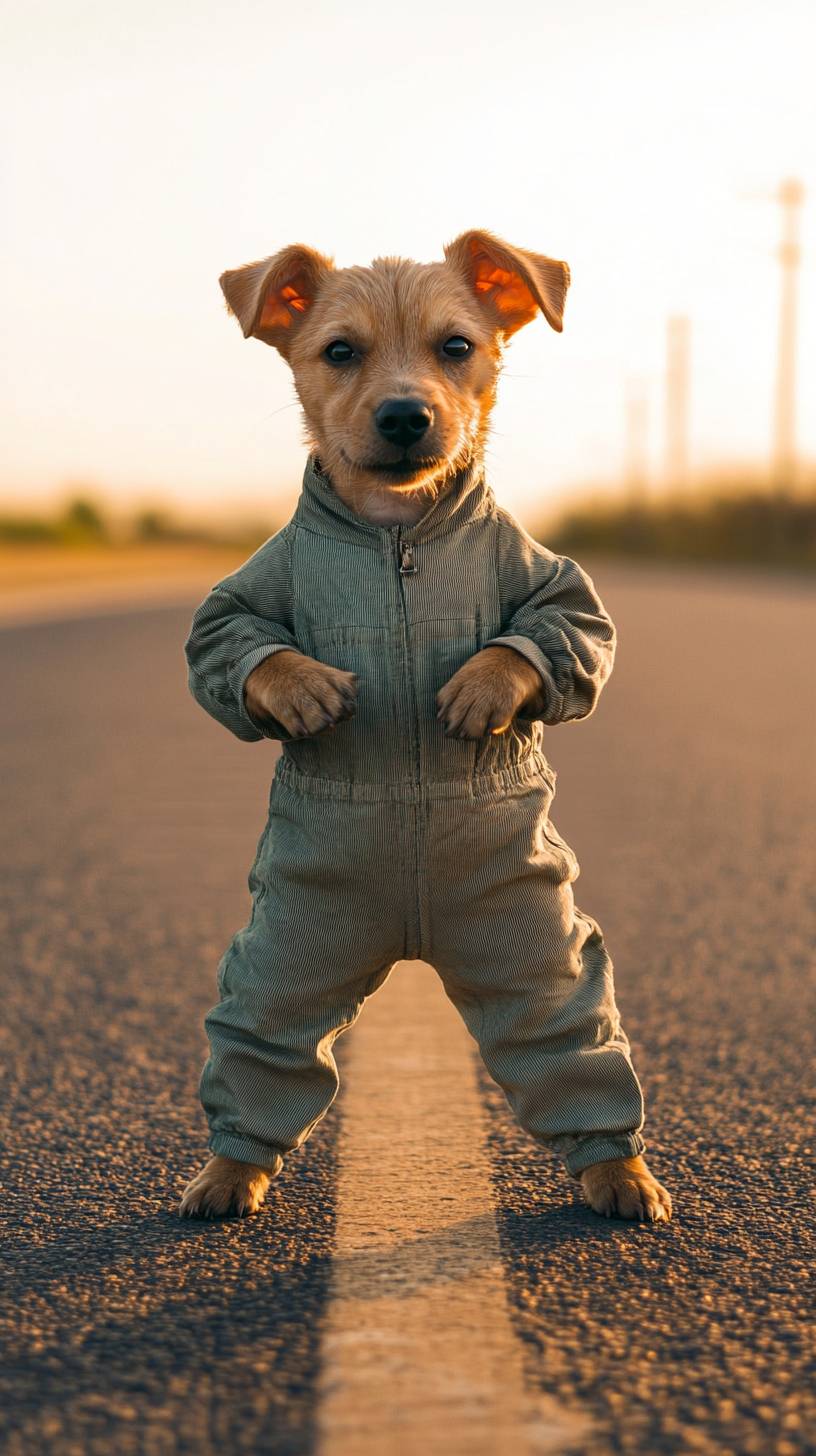 A dog in a jumpsuit stands on its hind legs, hands at its sides, body facing the camera, head facing the camera. The background is the road. The lighting is bright and natural, creating a bright and clear atmosphere --ar 9:16 --v 6.1