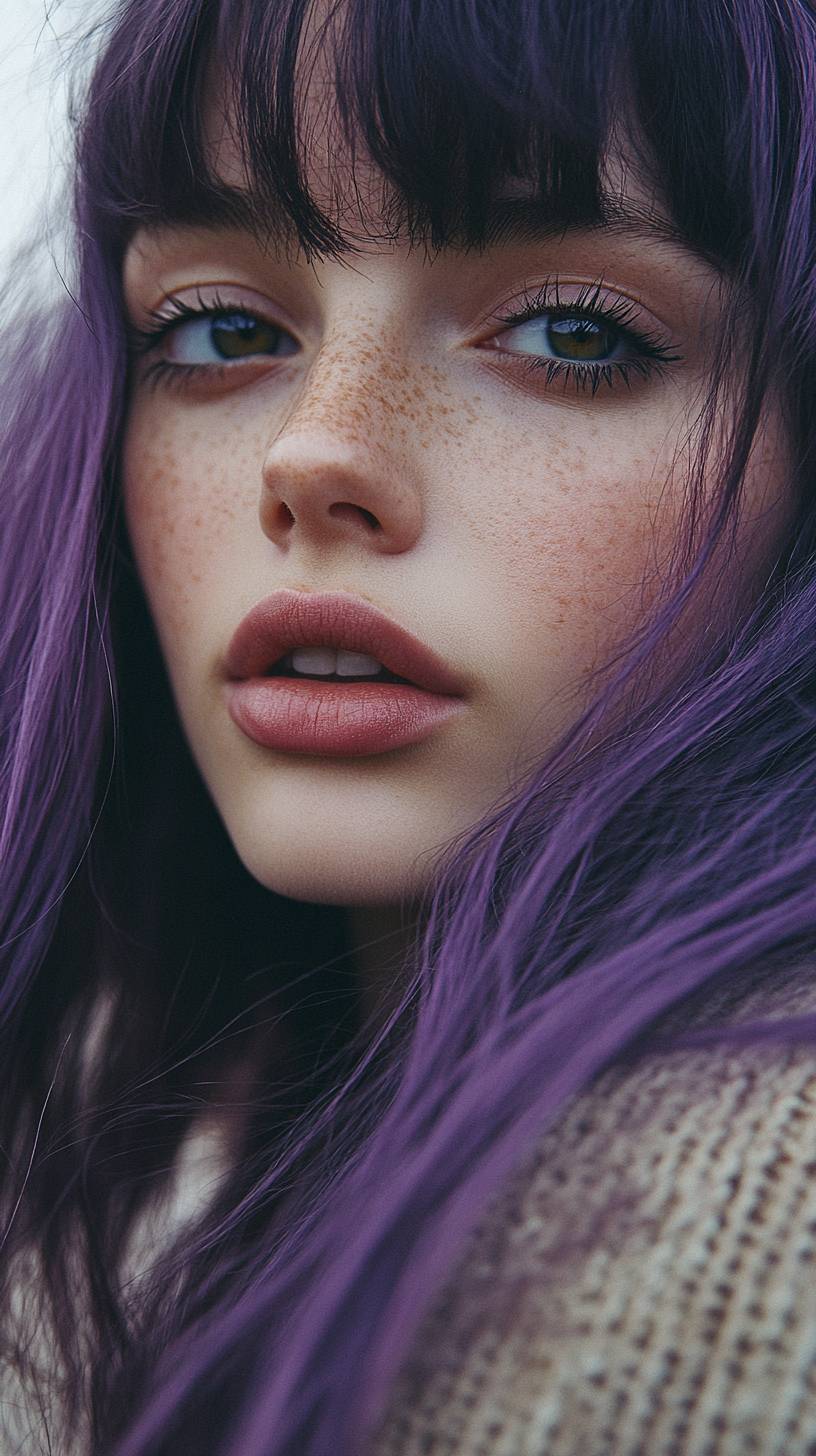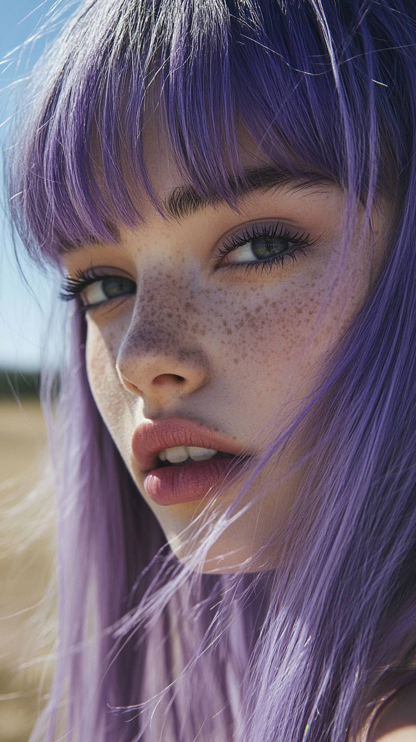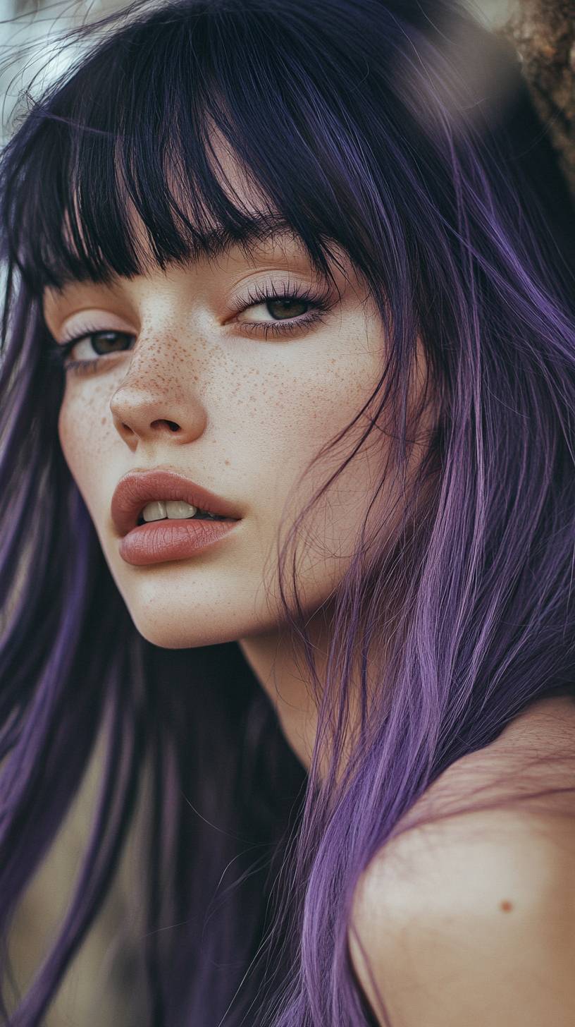 a close up photo of Spanish model with black eyes and purple hair model with bangs and long straight lavender colored hair, set against an out of focus which suggests natural surroundings, the photograph captures every detail of texture. --ar 9:16 --v 6.1