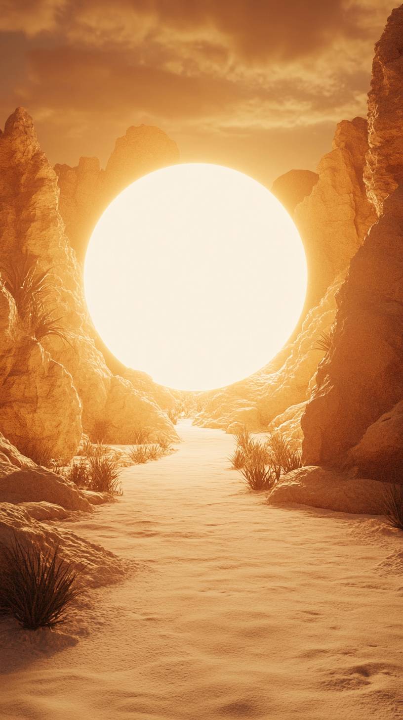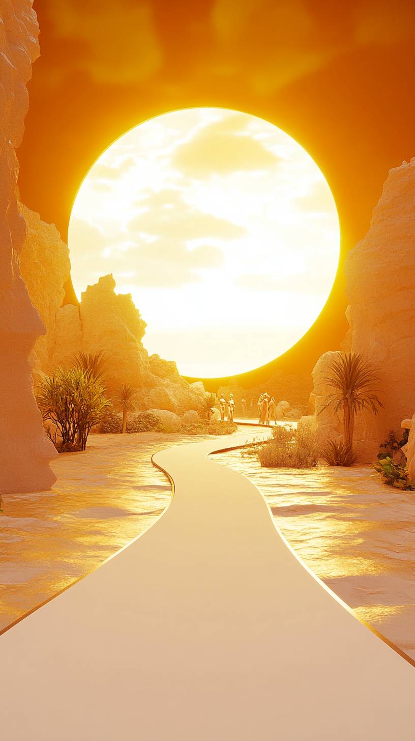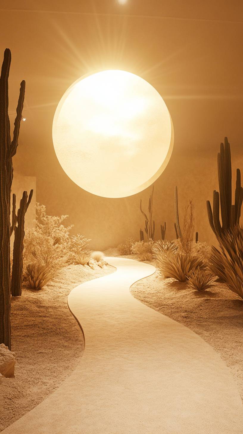 indoor show design, the background is a simulated western environment with desert and desert plants, the color palette is beige. A huge circular beam of light in the center that looks like a rising sun, a winding road in the middle of the frame as a route for the models to walk down the runway. High definition, very detailed, very clear, 8k --ar 9:16 --style raw --v 6.1
