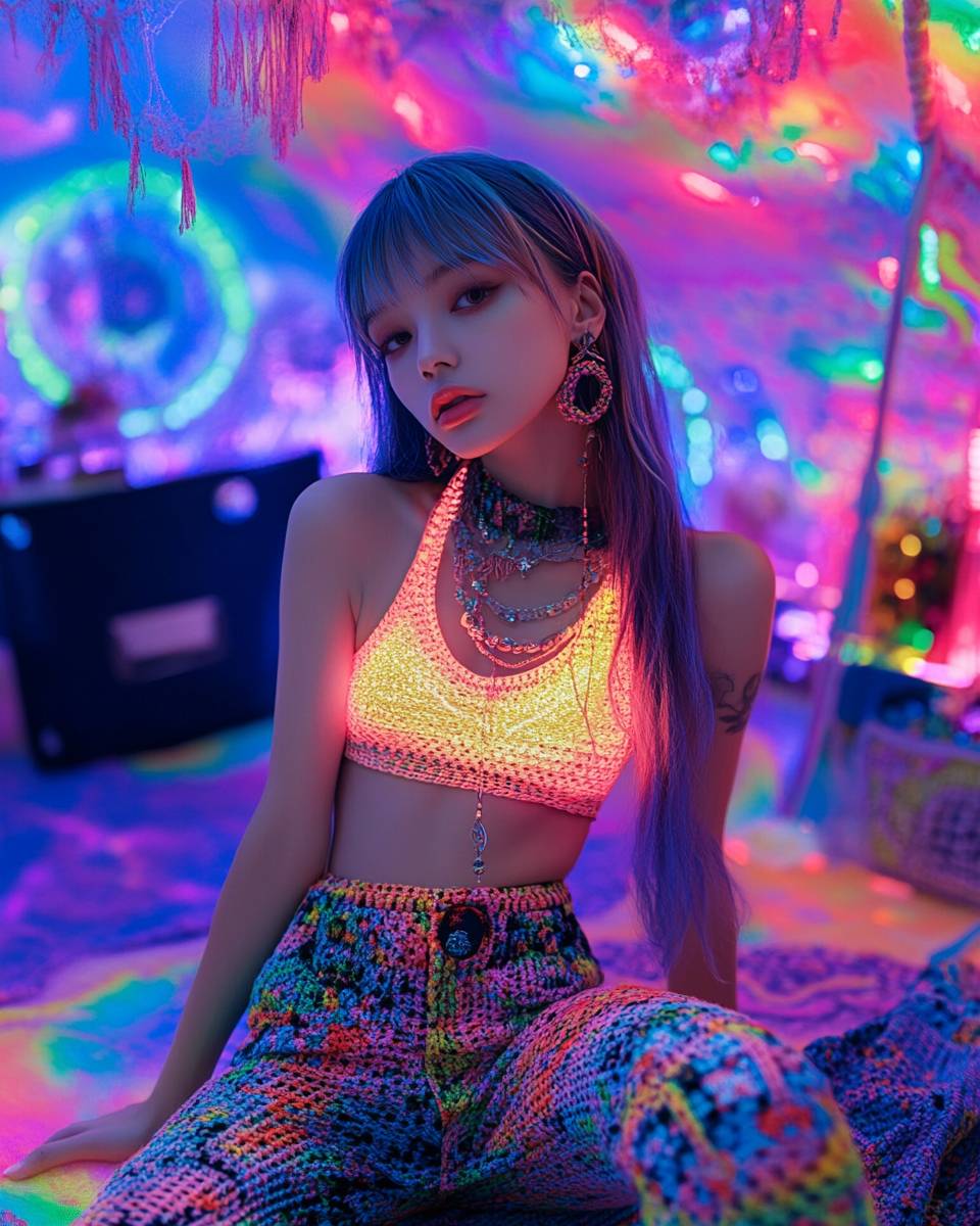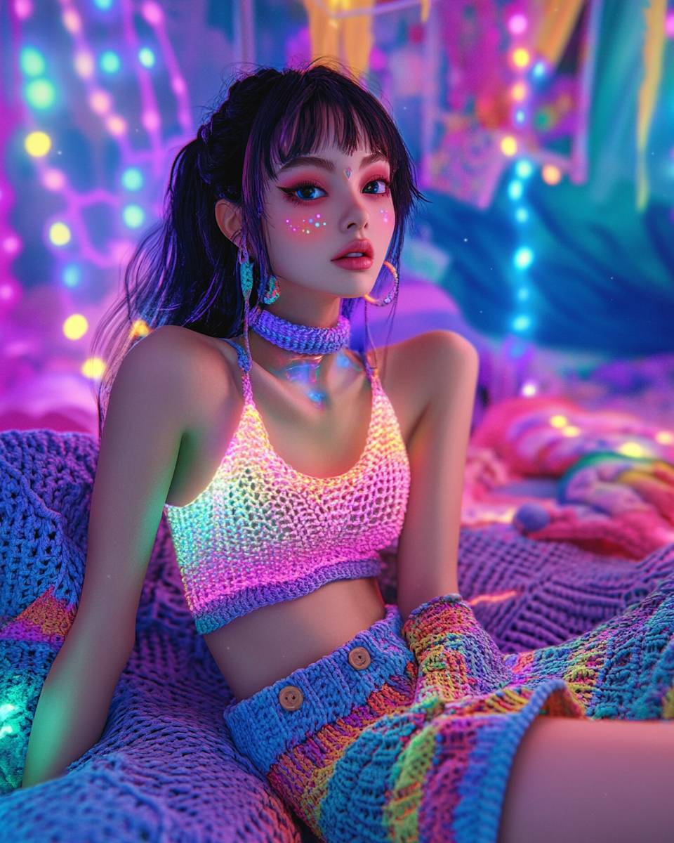 Photo of a cute kawaii anime woman, psychedelic, colorful and fluorescent background, wearing a colorful glowing fluorescent crochet tank top with colorful crochet jeans, in a tatami studio.
