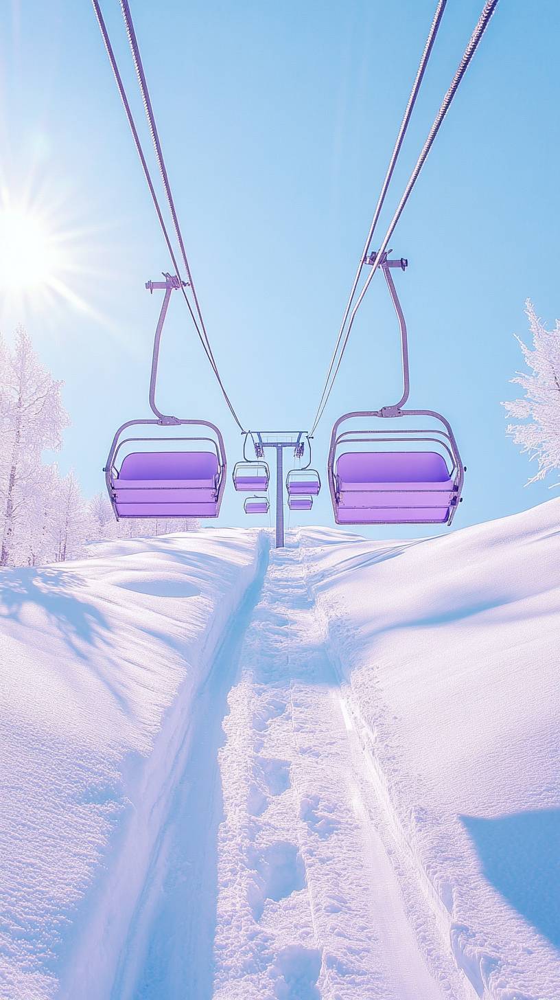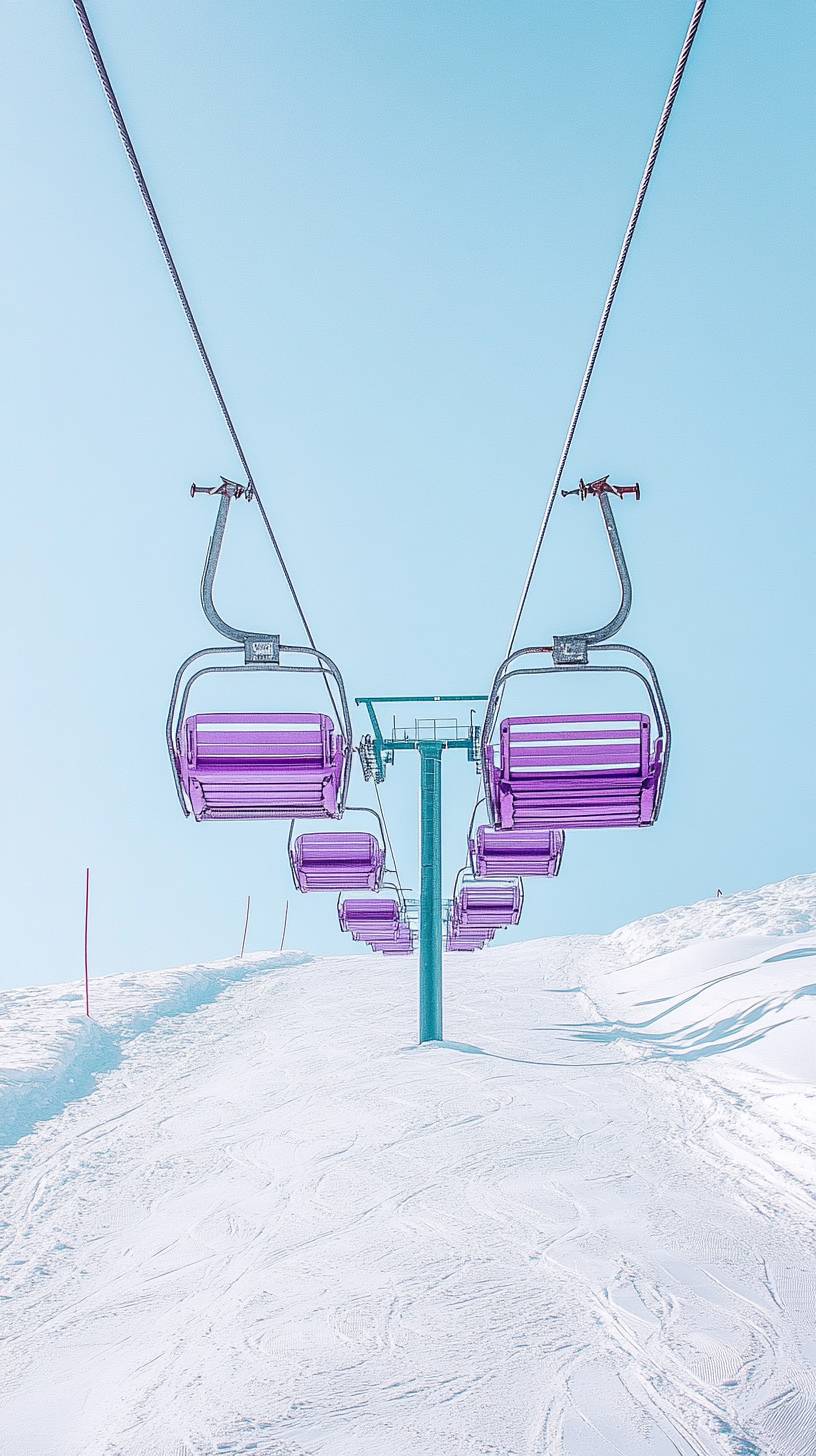 A detailed, high-resolution photograph of a ski lift traveling up a snowy mountain. The bright lavender chairs stand out against the clean, white snow and the clear blue sky. The image captures the lift from below, showing the ascending path of the chairs and the intricate details of the cables and poles. The scene is crisp and vivid, with clear contrasts and no vintage filters. --ar 9:16 --v 6.1