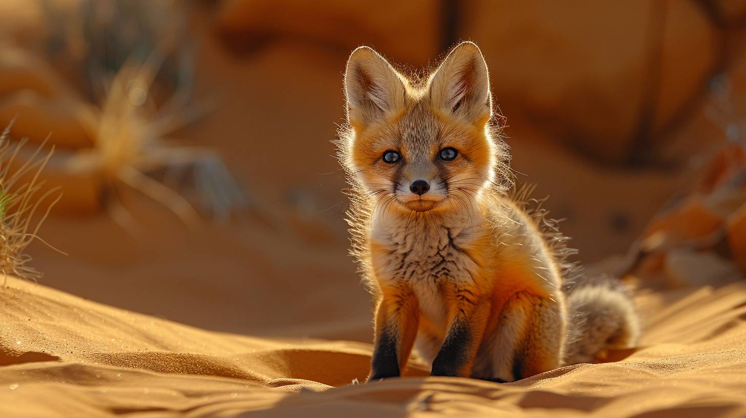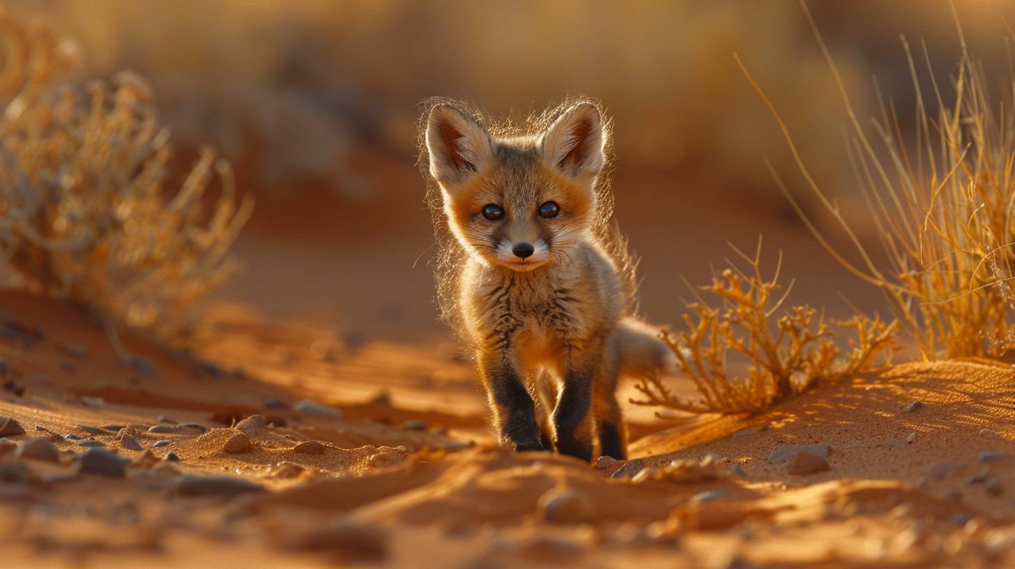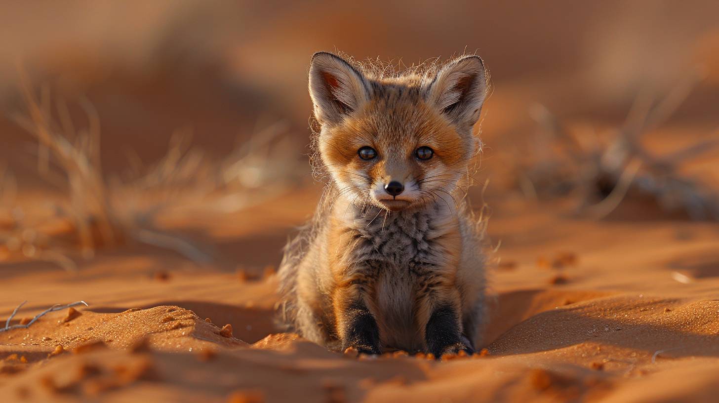 close up, adorable small tiny fluffy desert fox in the Sahara desert , taked by Canon EF 50mm f/1.2L USM lens on a Canon EOS 5D Mark IV camera, detailed macro wildlife photography by national geographic , morning light, hyperrealistic, hyper-detailed --ar 16:9 --s 1000 --v 6.0