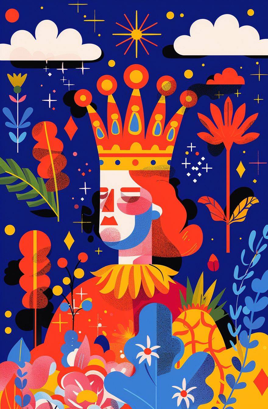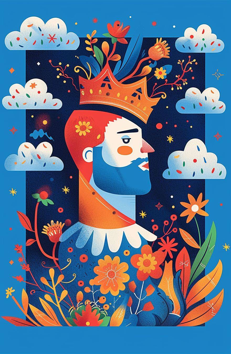 A colorful poster with bold shapes and vibrant colors featuring an illustration of a medieval king, clouds, plants, flowers, and sparkling orange smoke in the style of Keith Haring on a blue background. The poster has a flat design with editorial illustrations arranged in a symmetrical grid of highly detailed and simplified forms with flat color blocks in a symmetrical composition.