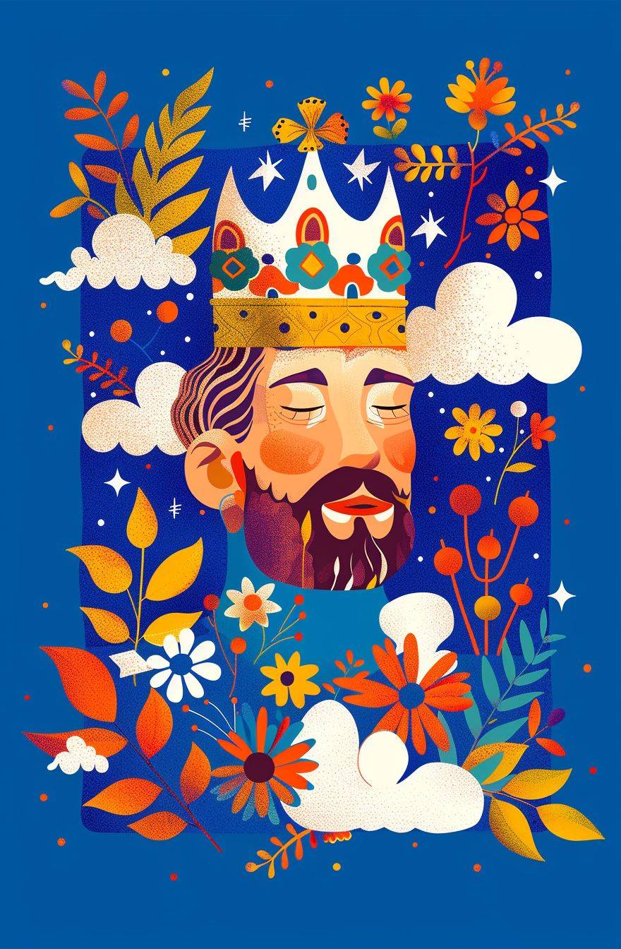 A colorful poster featuring a medieval king illustration with a blue background in a symmetrical design.
