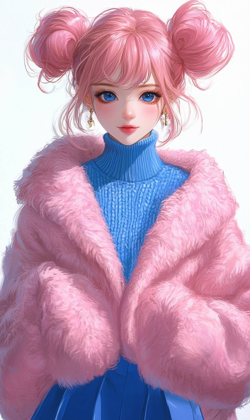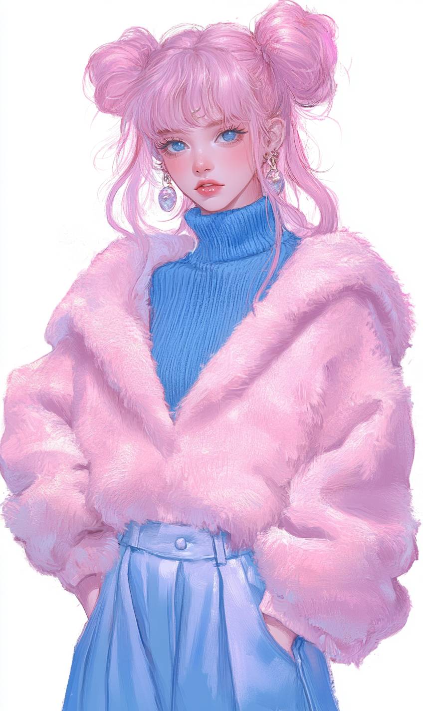 Create an exquisite anime-inspired illustration of a playful Sailor Moon-style woman, embracing a cute and bubbly aesthetic. Her porcelain skin radiates a soft, youthful glow. Her pastel pink shoulder-length hair is styled in a fluffy hair bun, amplifying her sweet and charming aura. Her striking sapphire blue eyes are piercing and commanding, gleaming with an air of confidence and inner strength. Standing tall, she embodies the essence of a 21st-century Modern Ronin. Her intricately detailed attire takes center stage, featuring a fluffy, pink long cardigan with a prominently displayed blue turtleneck sweater underneath, adorned with Kubo-esque design elements and textures. Flowing blue hakama pants complete her striking pink and blue ensemble, exuding modern Japanese elegance with a bold, fashion-forward twist. The overall aesthetic should blend high-fashion sensibilities with anime flair.