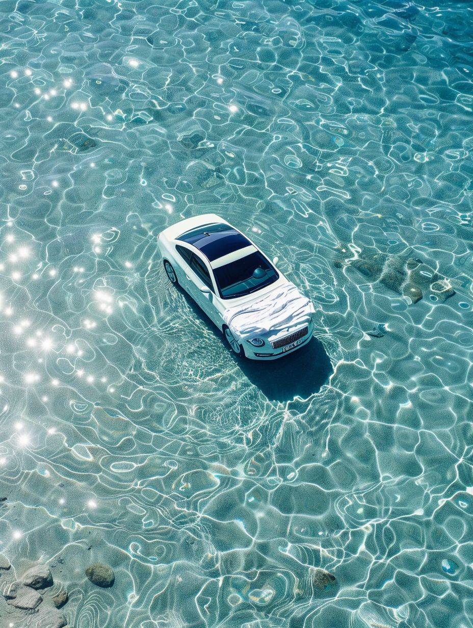 A car floats on a white thin blanket laid on the clear blue ocean water.