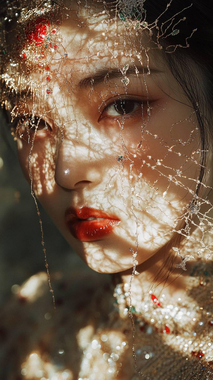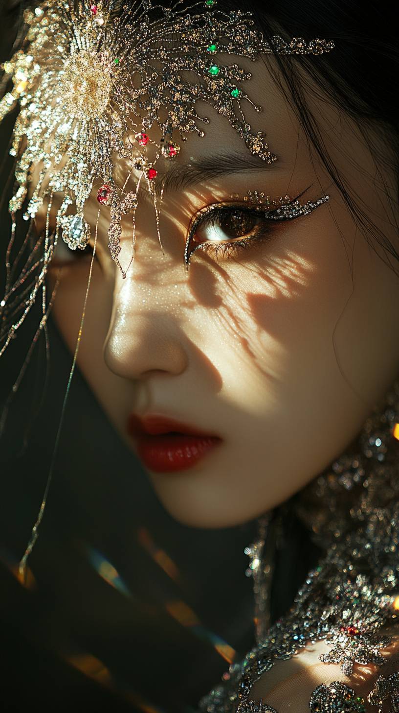 photograph of a beautiful creature in the form of an Asian woman, skin merged with embroidery and jewels, light reflections, muted tones --ar 9:16 --v 6.1