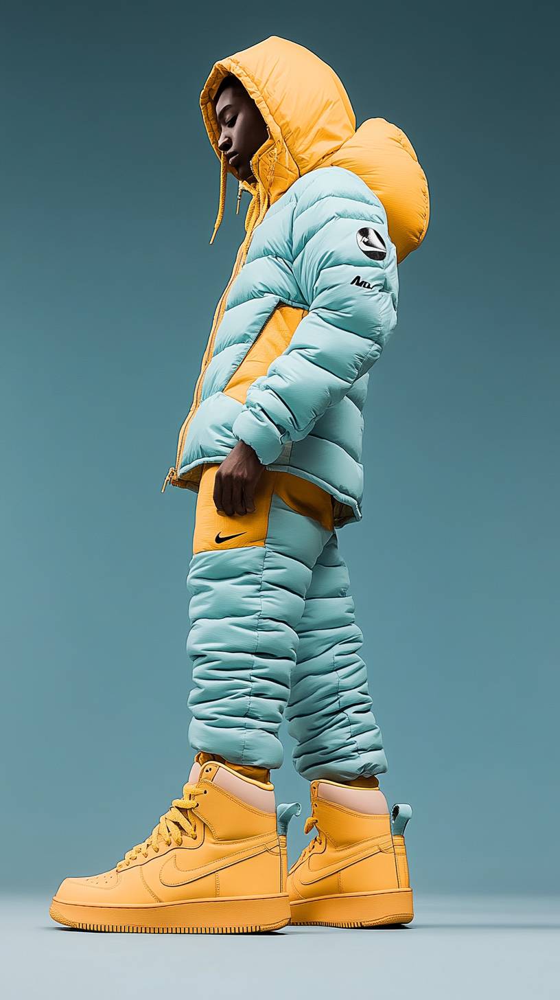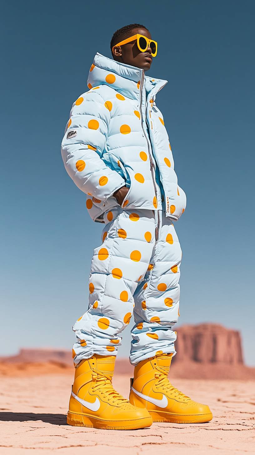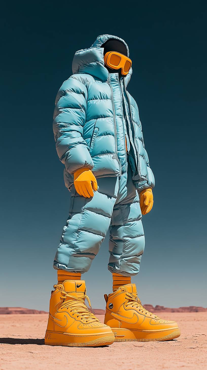A full body photograph of an inflatable blue dot puffer suit, with yellow nikes standing on the red rock desert at night. The background is a dark blue sky, in the style of Tim Walker. --ar 9:16 --personalize vuawqyk --stylize 750 --v 6.1
