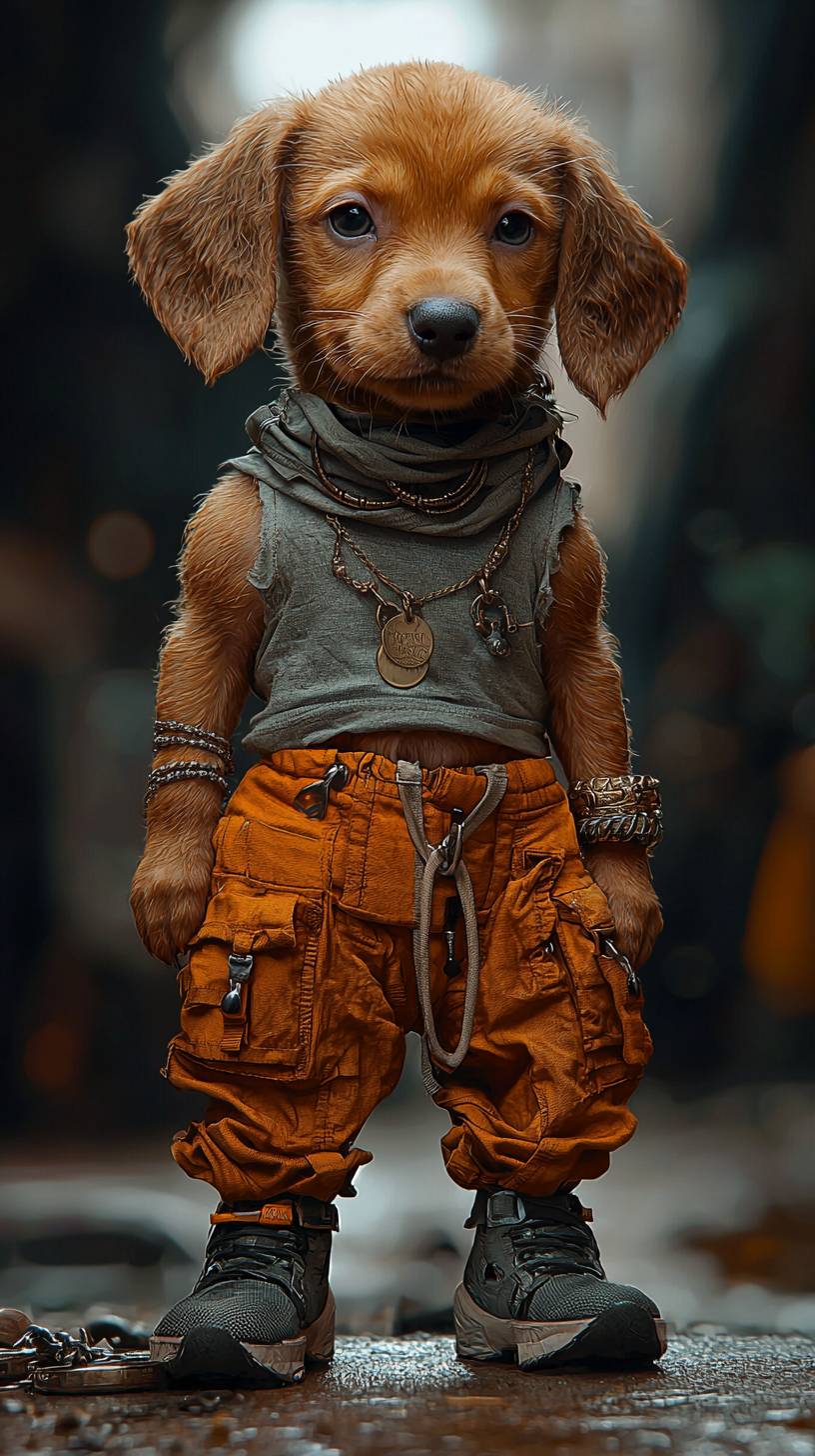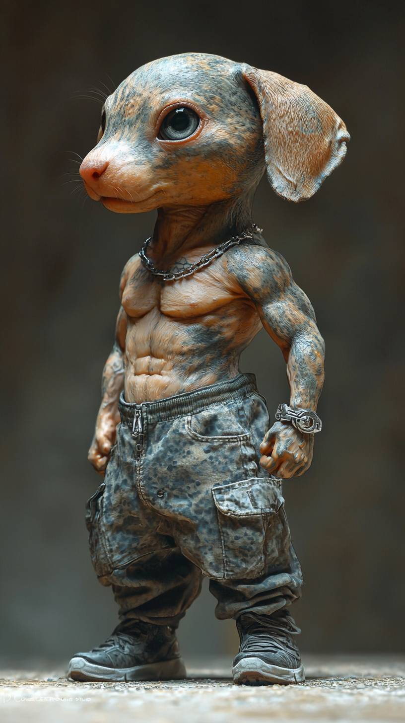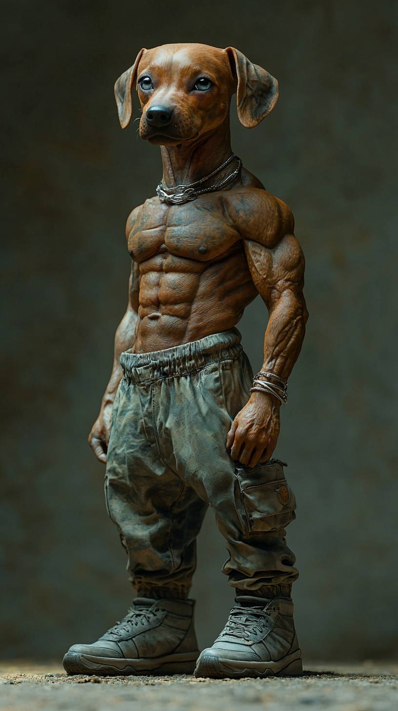 a human like sausage dog, muscled with a tank top, sausage dog is light grey with grey eyes, standing on his 2 feet like a human, sneakers on and jewelry --ar 9:16 --quality 2 --stylize 750 --v 6.1