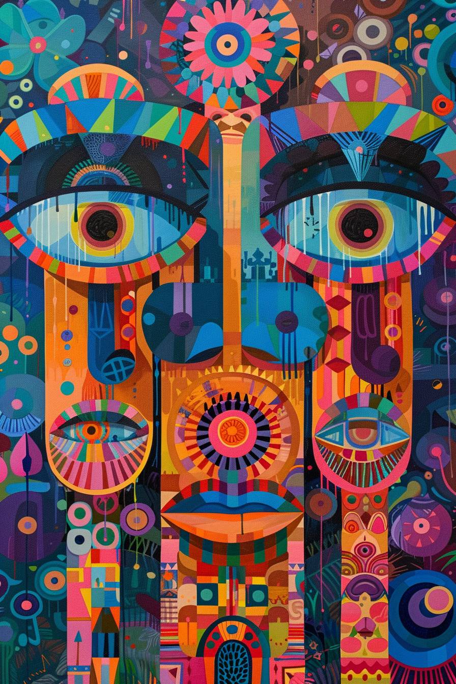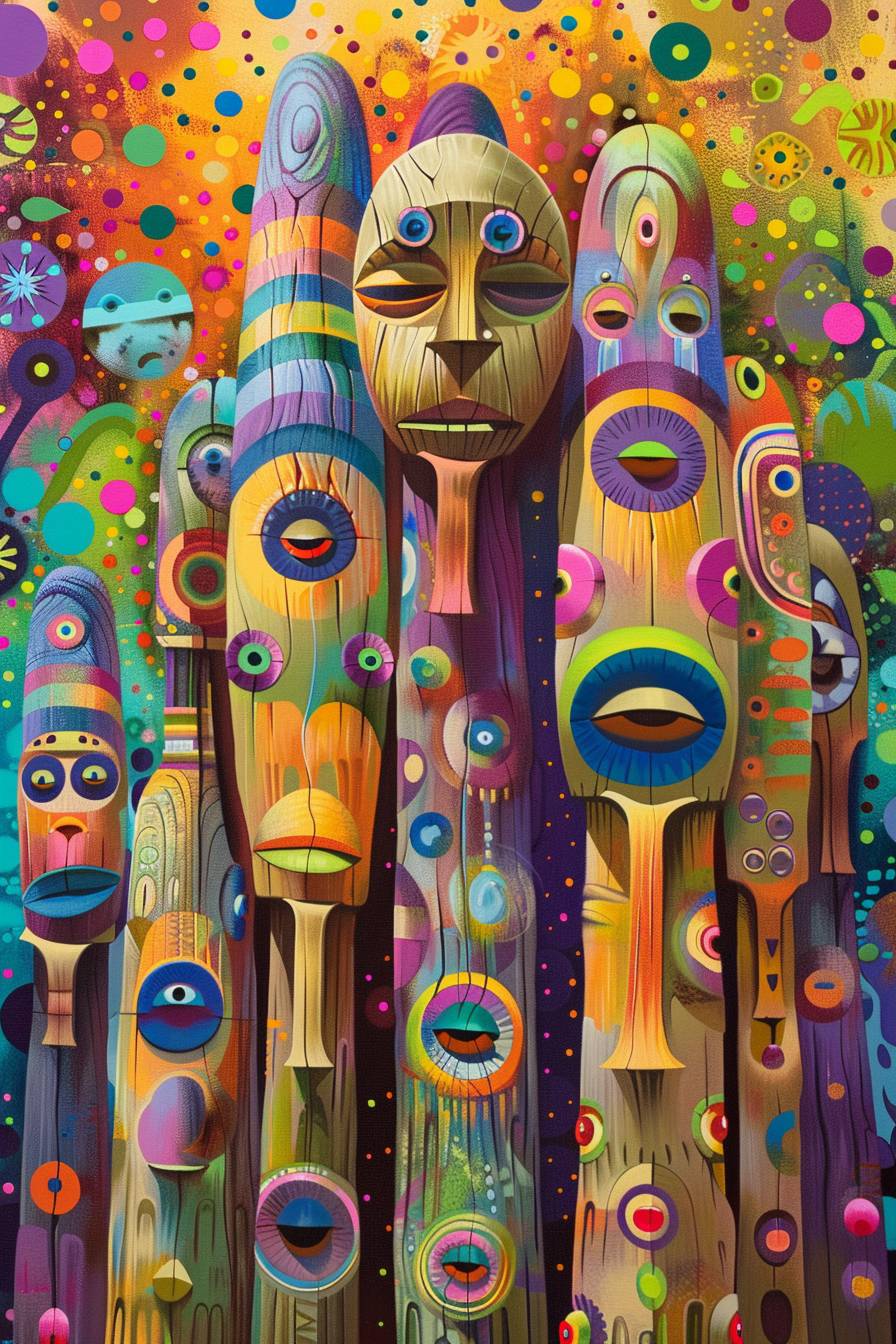 A surreal, vibrant painting of large wooden idols depicting elongated [SUBJECT] faces with different patterns and colors. They have large elongated heads with eyes that seem enormous in scale, surrounded by colorful circles and shapes that give off psychedelic vibes. --ar 2:3 --v 6.0