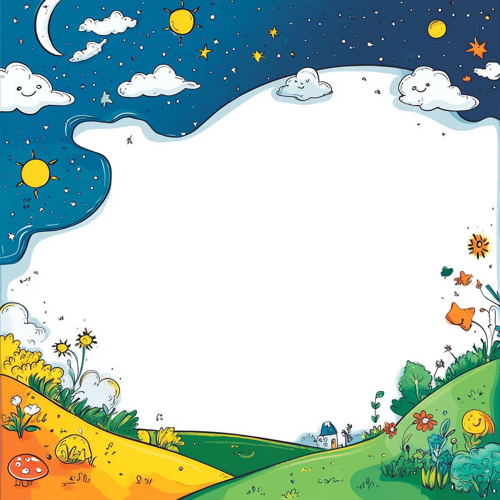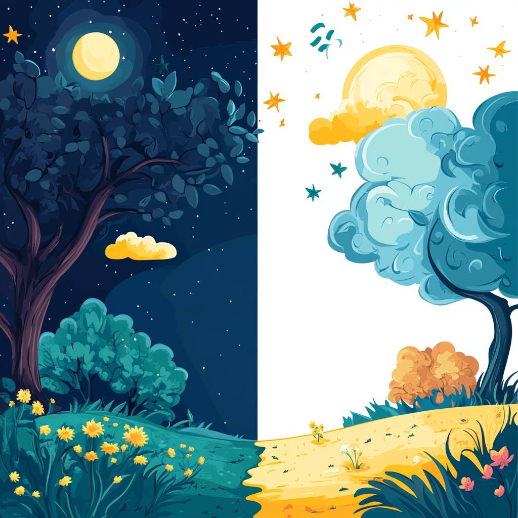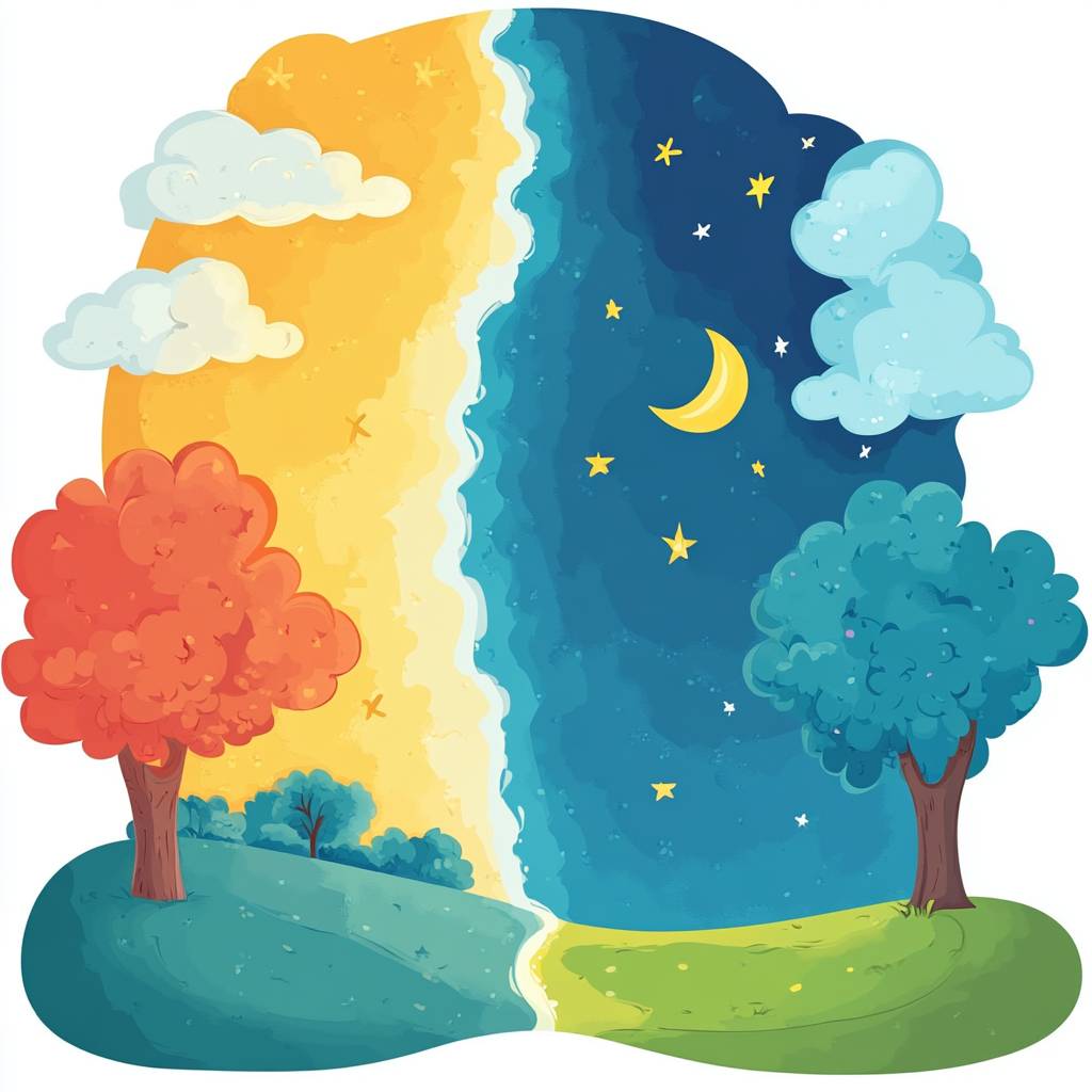 a simple bright cartoon scene for a song for kids showing night on the left and day on the right blended together and a big blank space in the middle to write the lyrics, white background --ar 1:1 --v 6.1