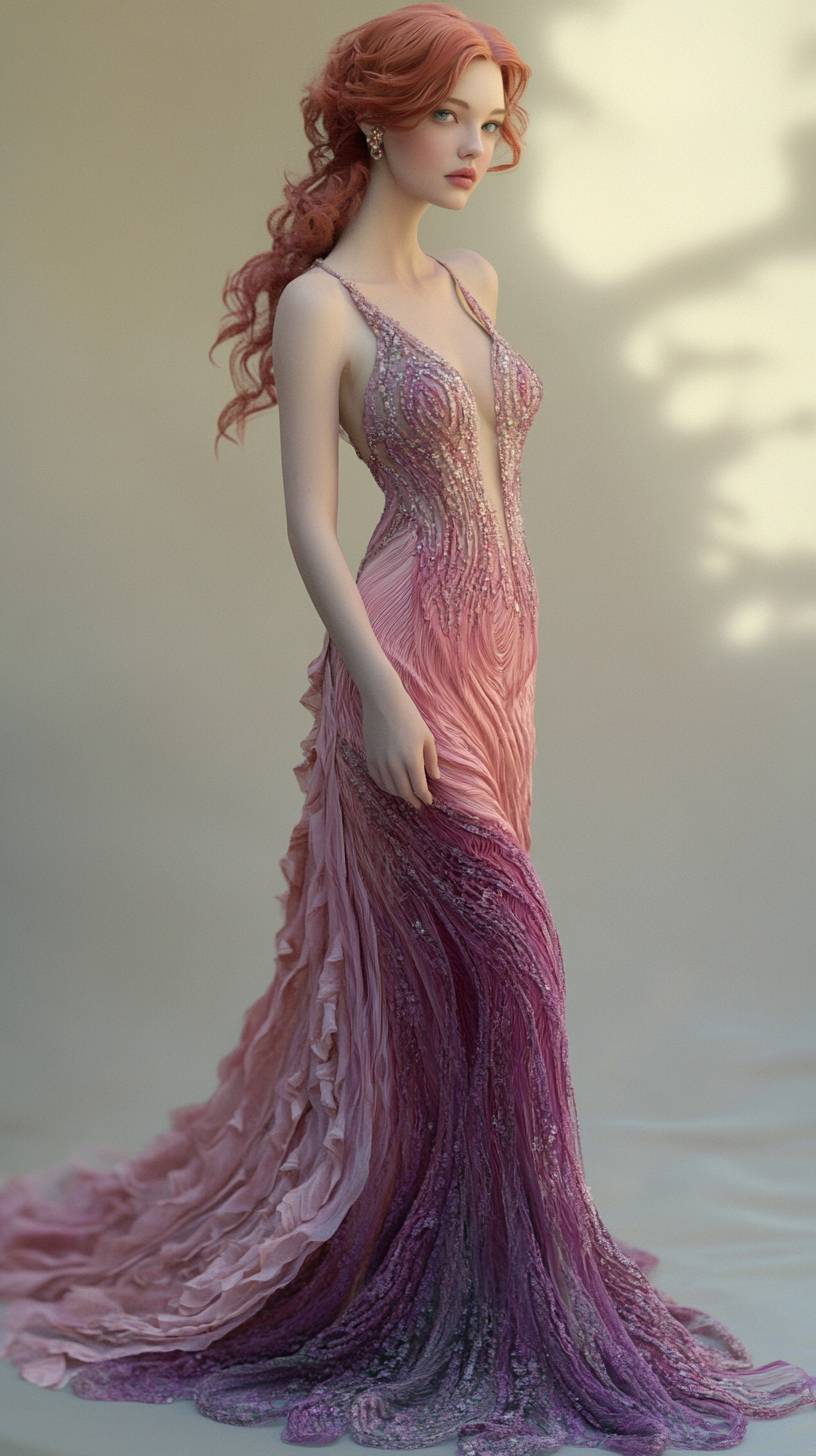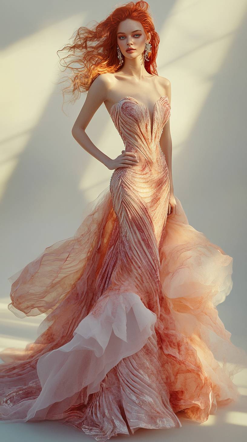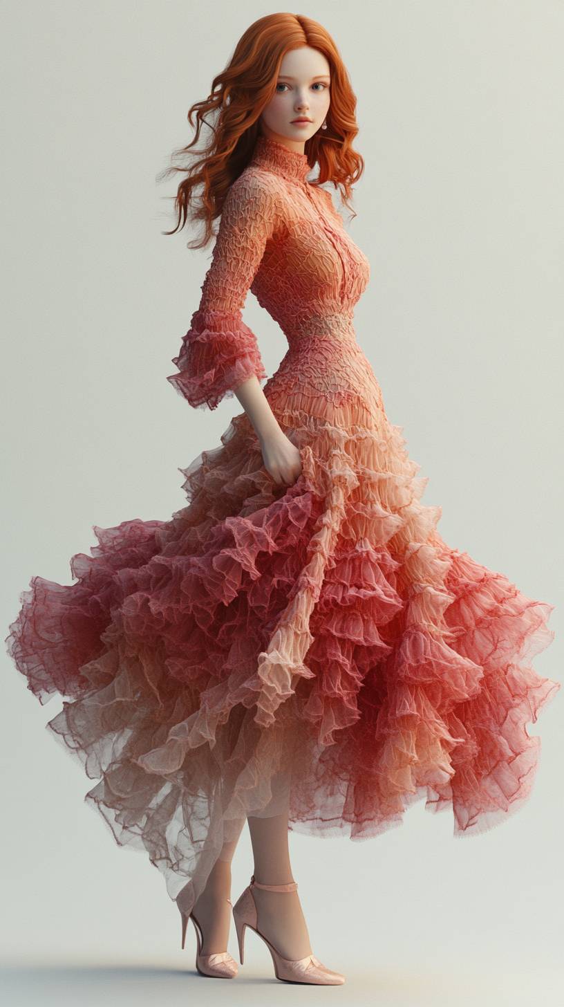 Create a realistic high-definition image of a full body beautiful woman with dusty red hair, in an elegant pose, wearing a salmon and magenta shades high detailed airy wave textured dress from the Spring Dior collection, with a neutral background in 4K resolution.