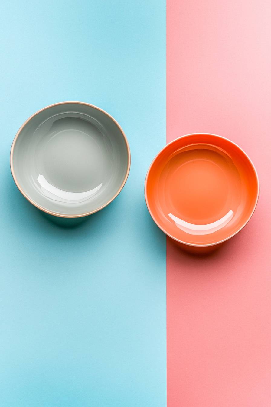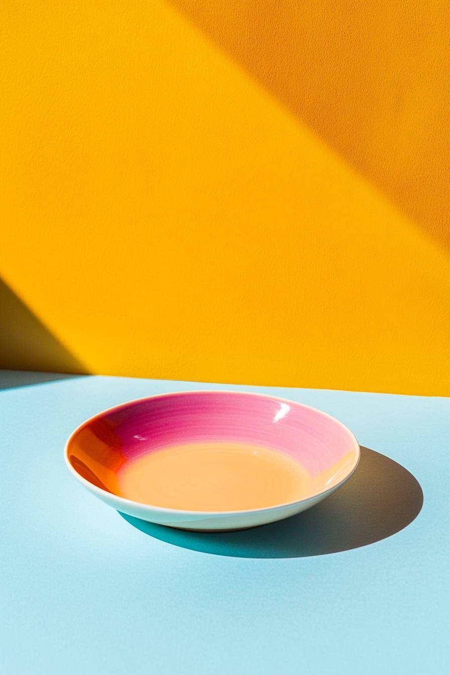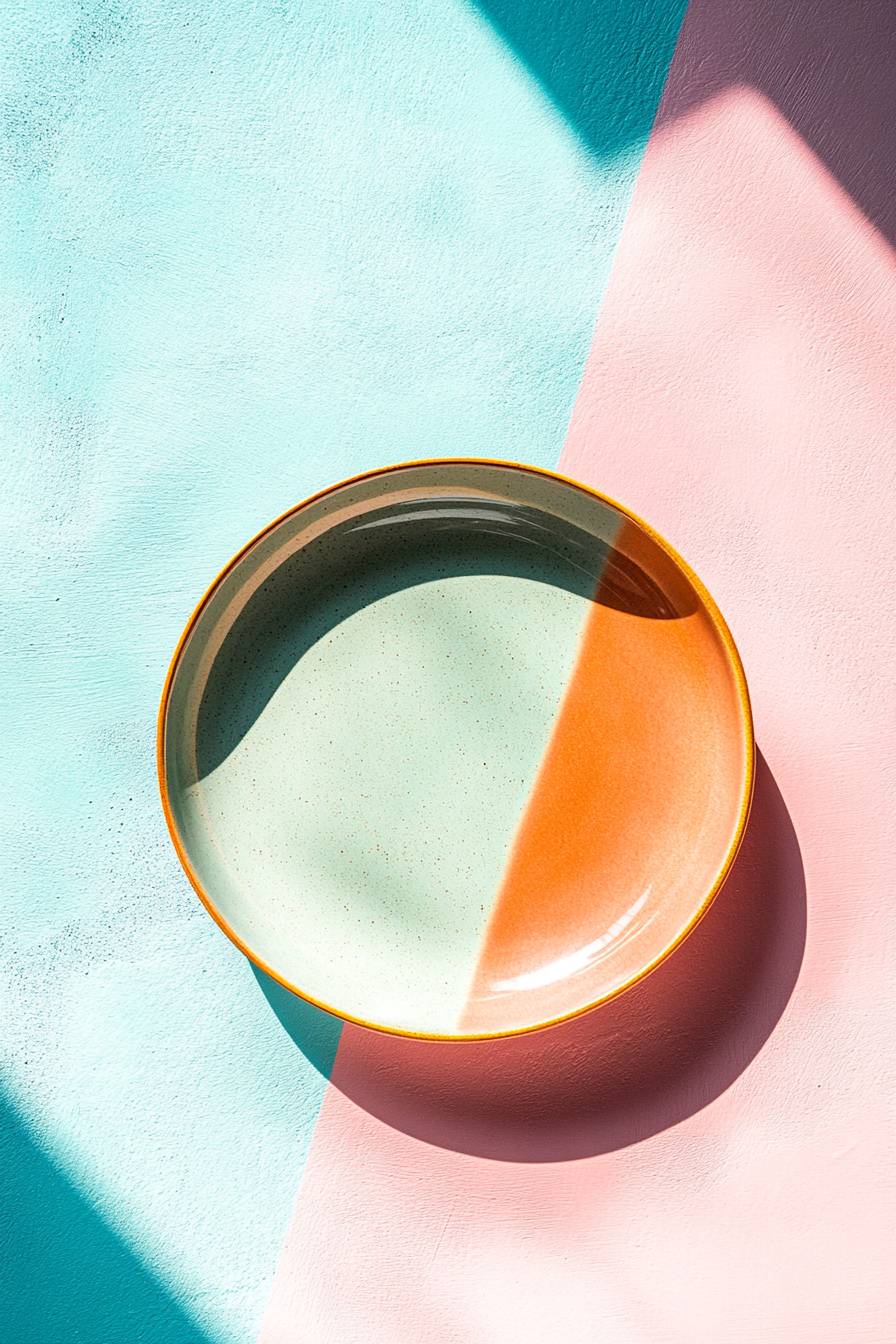 minimalistic photograph of a ceramic colorful plate, in wide minimalist kitchen, inspirational, fresh color palette, --ar 2:3 --v 6.1