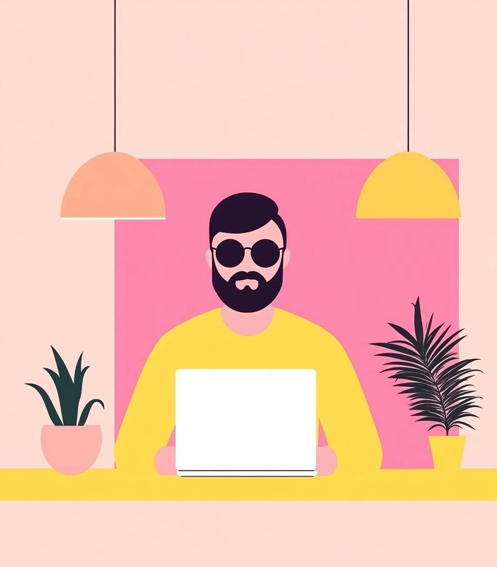 Vector illustration, man working, flat design, simple geometric shapes, soft color palette, no shadows or depth, clean lines, modern and minimalist style