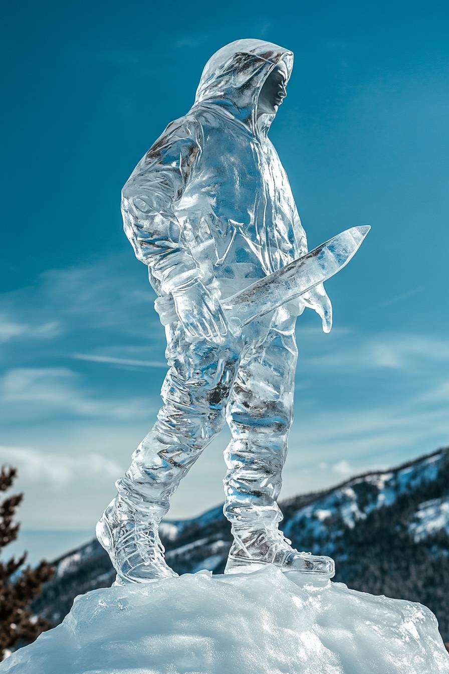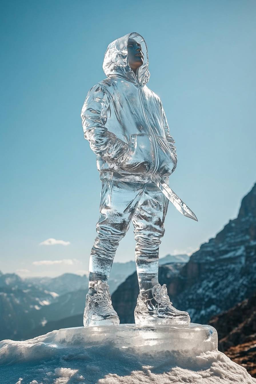 an ice sculpture of zhang qiling, wearing a hoodie, wearing a tight version of sportswear, slender figure, back carrying an ice sculpture knife, standing on the top of the mountain, full body photo, the picture is clear, crystal clear, upwards photo. --ar 2:3 --v 6.1