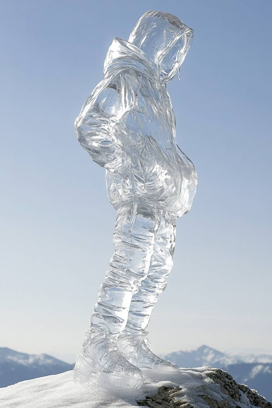 An ice sculpture of Zhang Qiling, wearing a hoodie and tight sportswear, slender figure, carrying an ice carving knife on his back, standing at the top of a mountain, full-body photo, the picture is clear, crystal clear, upward photo.