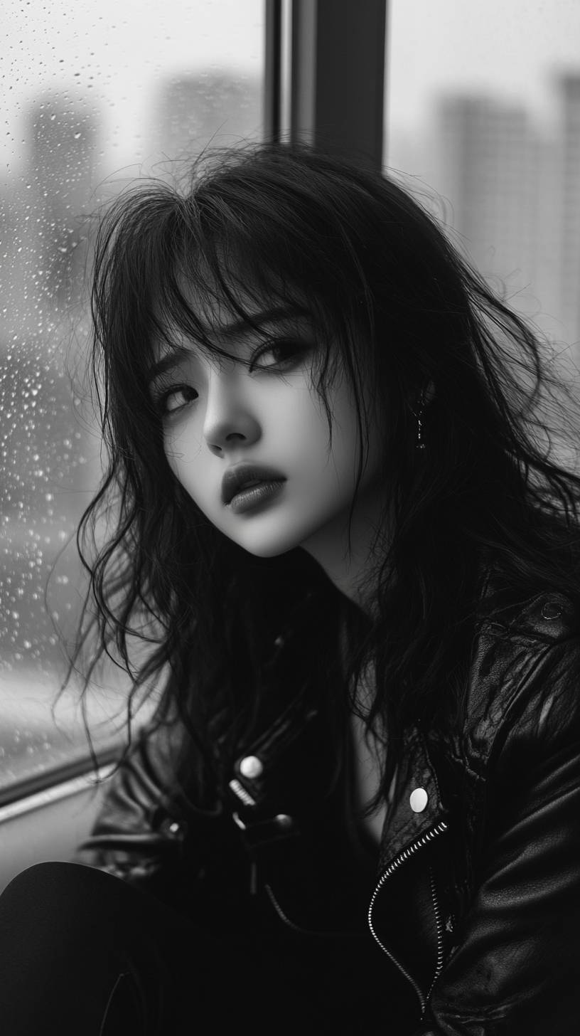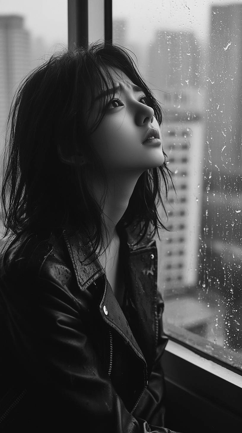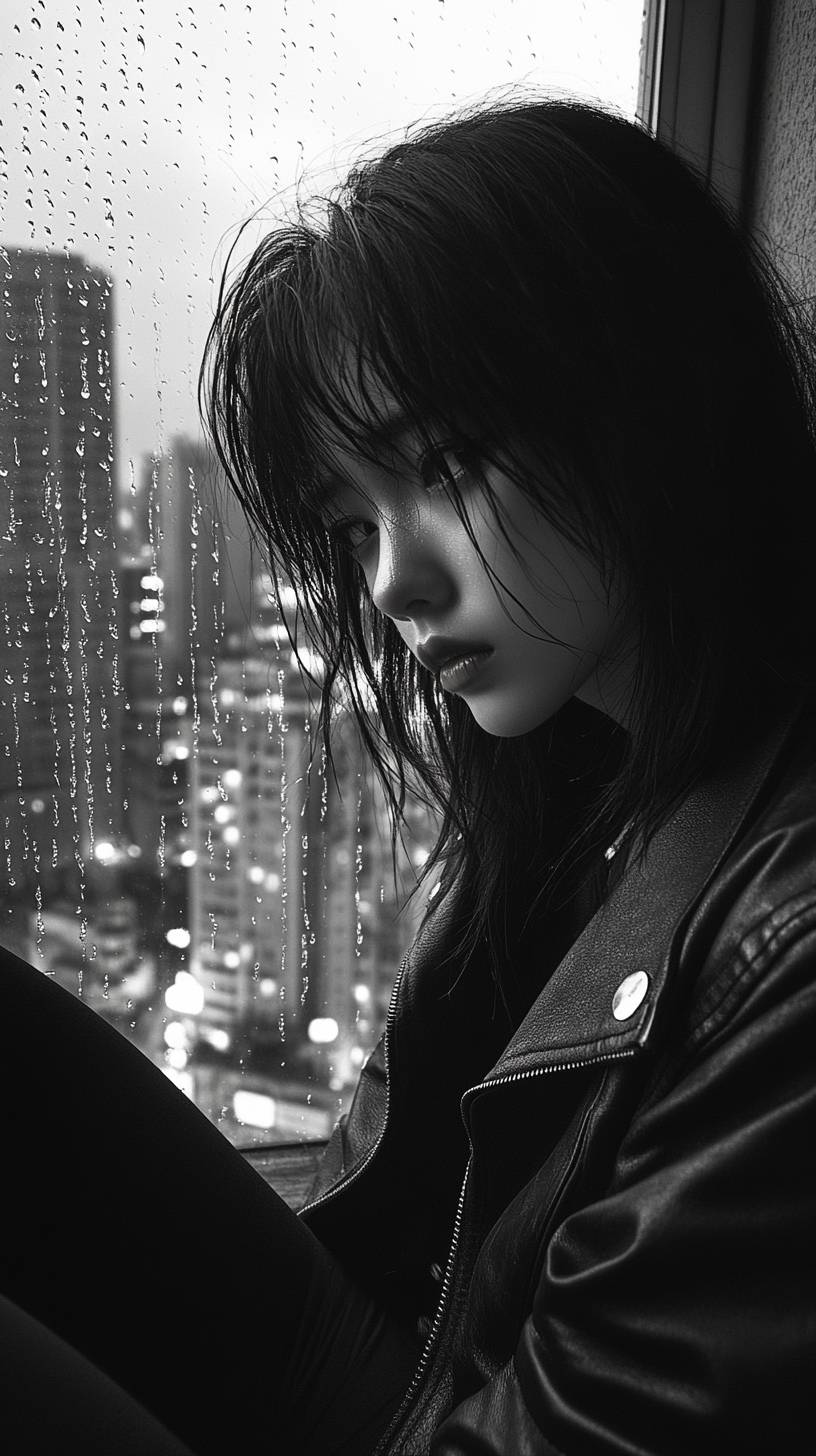 beautiful delicate face Chinese 17-year-old girl, sitting on the rooftop of a high-rise building, Wearing a leather jacket, full body close-up, sad mood, crying, tears, raindrops on the window, dim light outside the window, black and white color of the figure, 32k --ar 9:16 --style raw --v 6.1