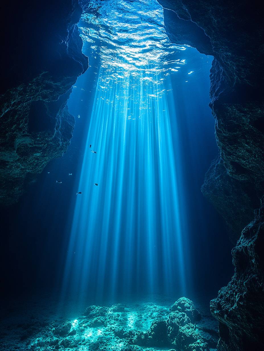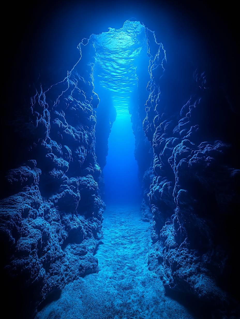 black deep sea, dark water, blue light, dark fish in the distance swimming, darkness, cave entrance on the right side of the frame, glow from inside the cave, underwater photography in the style of --chaos 30 --ar 3:4 --stylize 750 --v 6.1