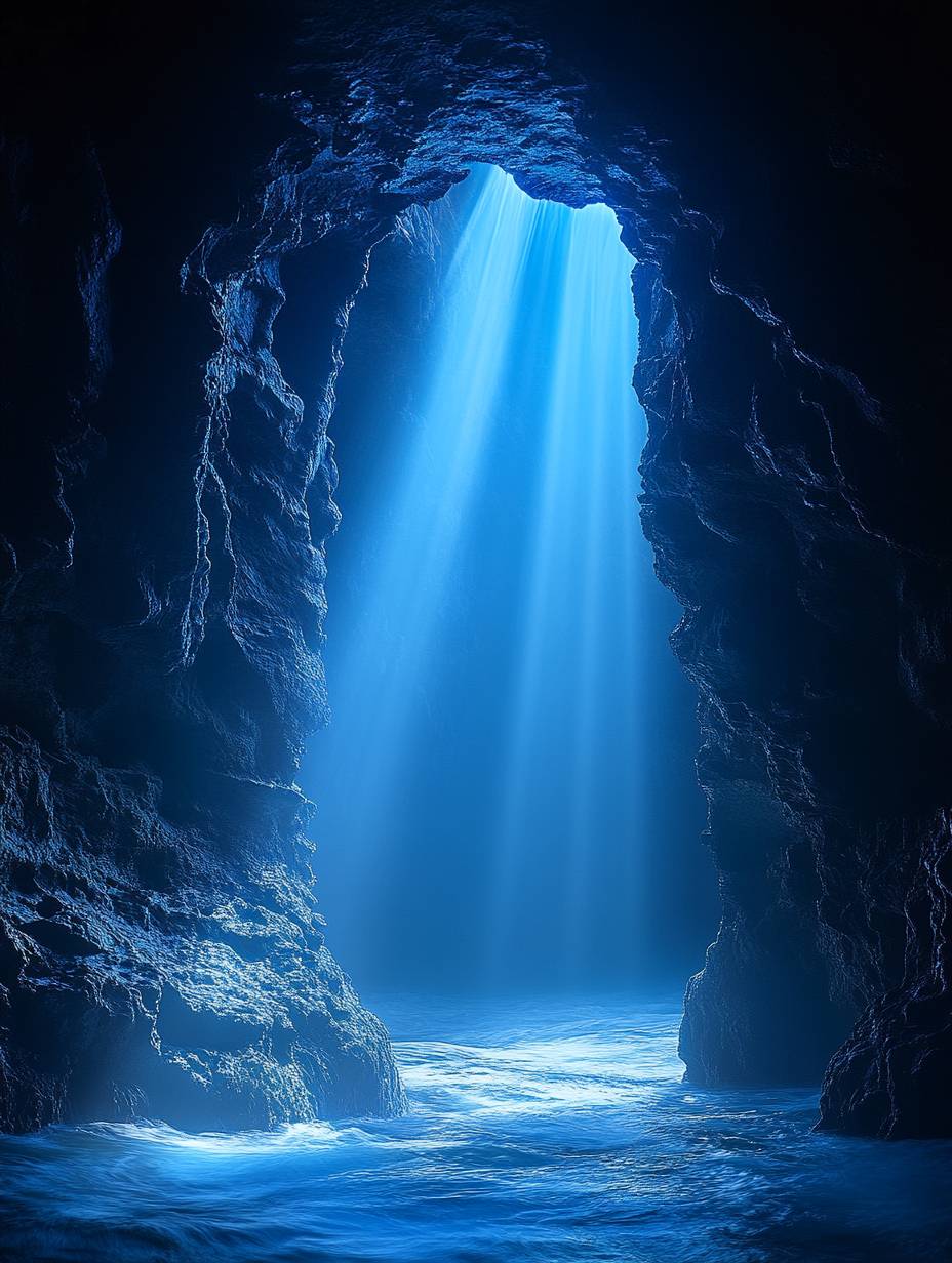 Blue light in the dark deep sea and cave