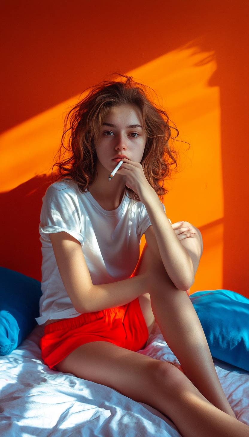 Hyper realistic photograph for news media of a young Eastern European woman who is smoking and sitting on a bed in a bright orange room. The woman has wavy brown hair that looks tousled as if she just woke up, fair skin, and expressive dark eyes. She is wearing a white T-shirt and bright red shorts. She is barefoot and has a thoughtful expression on her face, resting her chin on her hand. The lighting creates soft shadows, emphasizing the vibrant colors of the room. Natural light is streaming into the room, adding to the warmth and brightness. The background is a solid orange with some light reflections. There are two blue cushions on the bed., Inspiring photo, these photographs taken with an SLR or mirrorless camera, --no words text watermarks signatures captions subtitles scrolling-tickers logo-mark logo-text description commentary title-statement title-wording --ar 4:7 --style raw --stylize 50 --v 6.1
