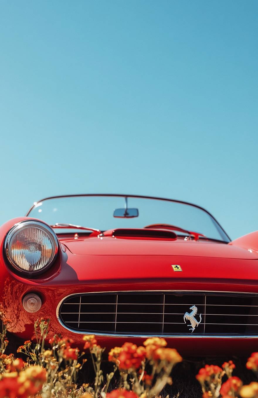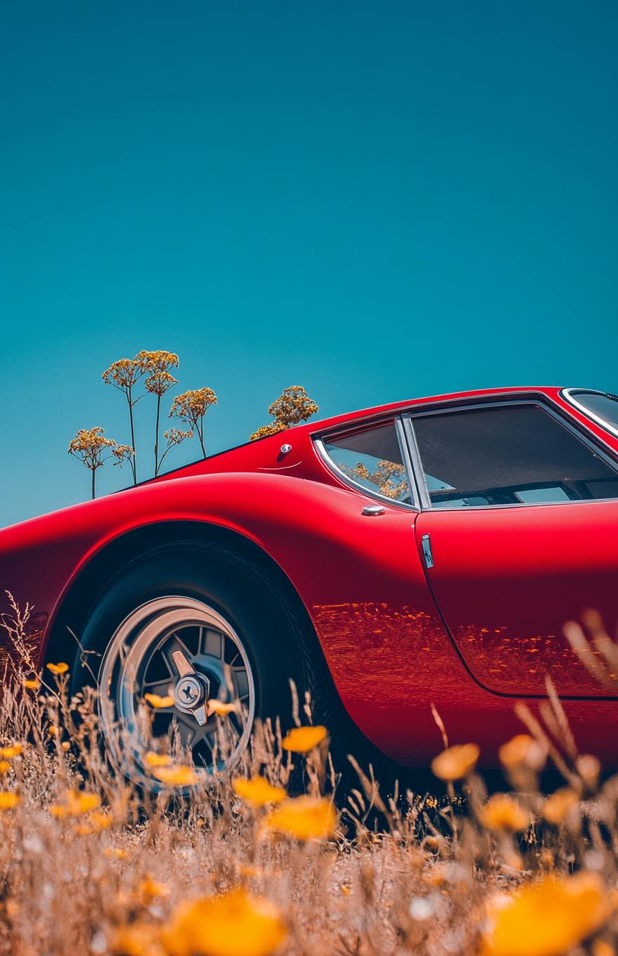 vintage Ferrari with a clear blue sky background. The photography has a minimalist style with a macro lens and soft light. The vertical composition has sharp focus on the top of the plants. Vibrant colors are used. --ar 83:128 --v 6.1