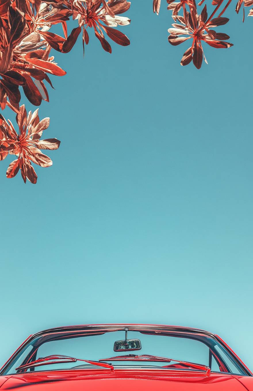 A vintage Ferrari against a clear blue sky background. The photography features a minimalist style with a macro lens and soft light. The vertical composition has sharp focus on the tops of the plants. Vibrant colors are used.