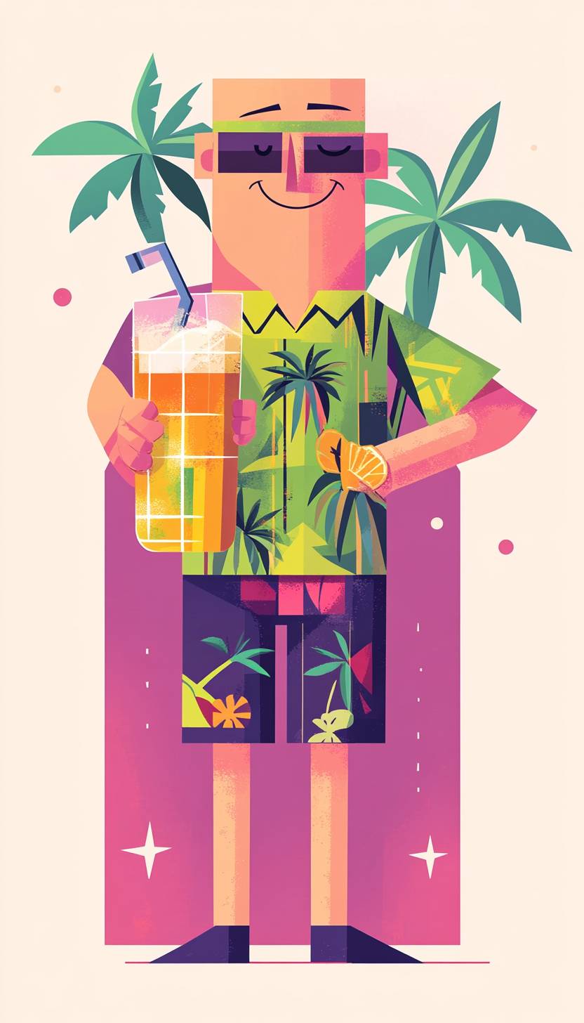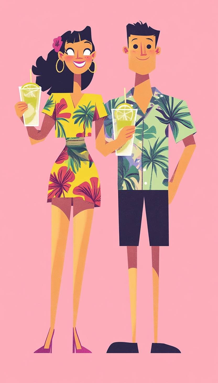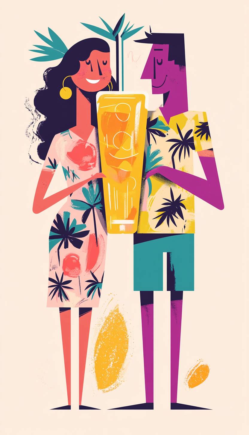 cubist head and huge extremely straight forms minimal flat vector illustration of a stylised happy high tall stylised laughing WOMAN AND MAN holding a huge glass of limonade, dressed with colorfull Hawaiian shirt with palm trees, full body, good face definition with small black eyes,WOMAN AND MAN, faceless face,WOMAN AND MAN, small girl seven years old, very simple face in profile, square-shaped head, rectangular-shaped head, cubist head with extremely straight forms, very simple draw, minimal style, modern shapes, faceless face, vector, low details, disproportionate body, long legs, long arms, square face, square shapes, light pink background, purple and light red pastel tones, good face definition with small black eyes, straight lines, minimalist, straight and super-stylised shapes without curves, minimal expression, square shapes minimalism, very long arms, slim body, slender and elongatedly exaggerated body, square-shaped head, rectangular-shaped head, cubist head with extremely straight forms, stylised outlines, elongated body, disproportionate body, straight lines, stylised, minimalist lines, in the style of Vicent Ramon --ar 4:7 --v 6.1
