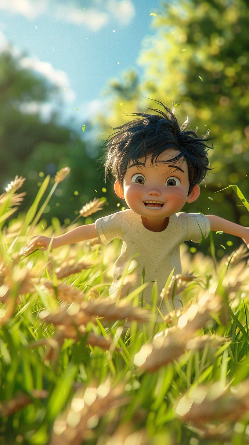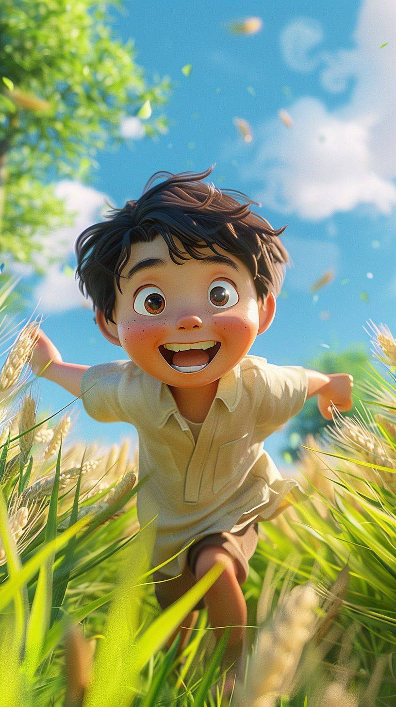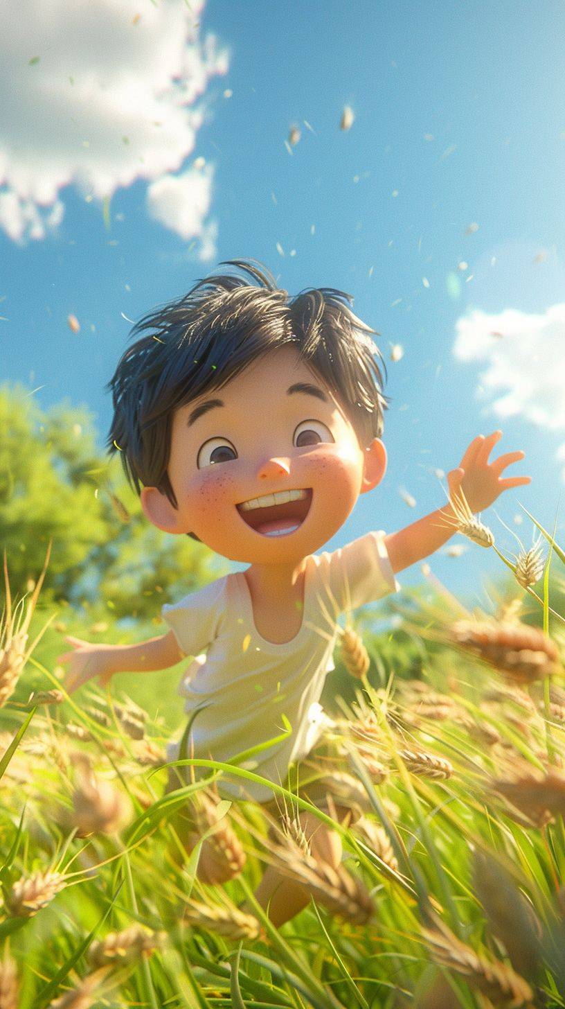 Cartoon 3D scene, front view, close-up, an Asian boy happily running in a green wheat field, summer scene, green and blue, bright color scheme, 3D rendering, Blender, --ar 9:16 --stylize 250