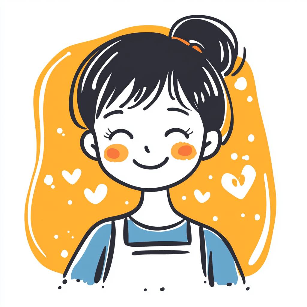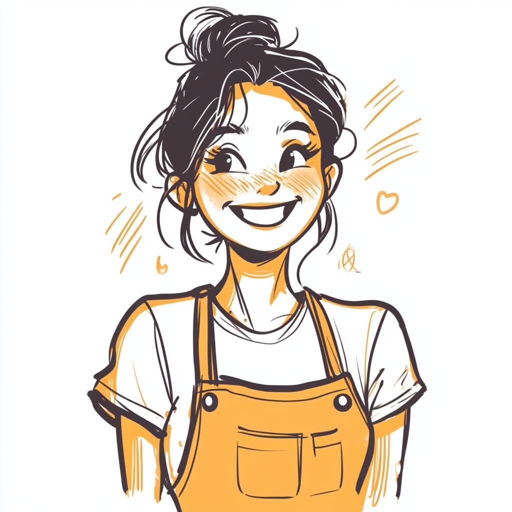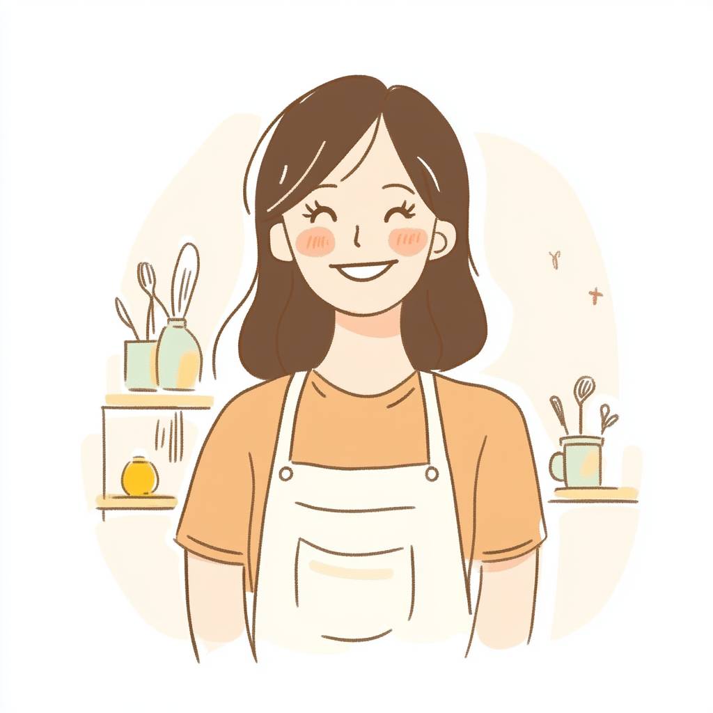 A housewife in her 30s with a big smile on her face. An illustration in a doodle style, as if drawn by a child. Designed in Ghibli style.