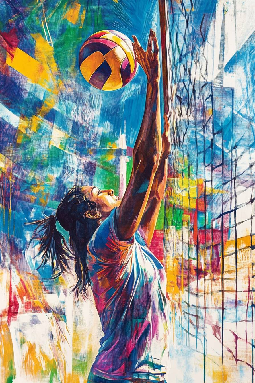 volleyball at Olympics games in Paris, Gaspare Caramello transconceptual art' s style, vivid and brilliant colors. --ar 2:3 --v 6.1