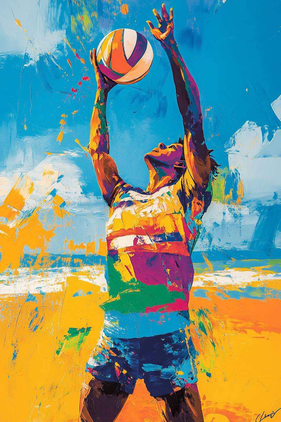 Volleyball at the Olympic Games in Paris, Gaspare Caramello's transconceptual art style, vivid and brilliant colors.