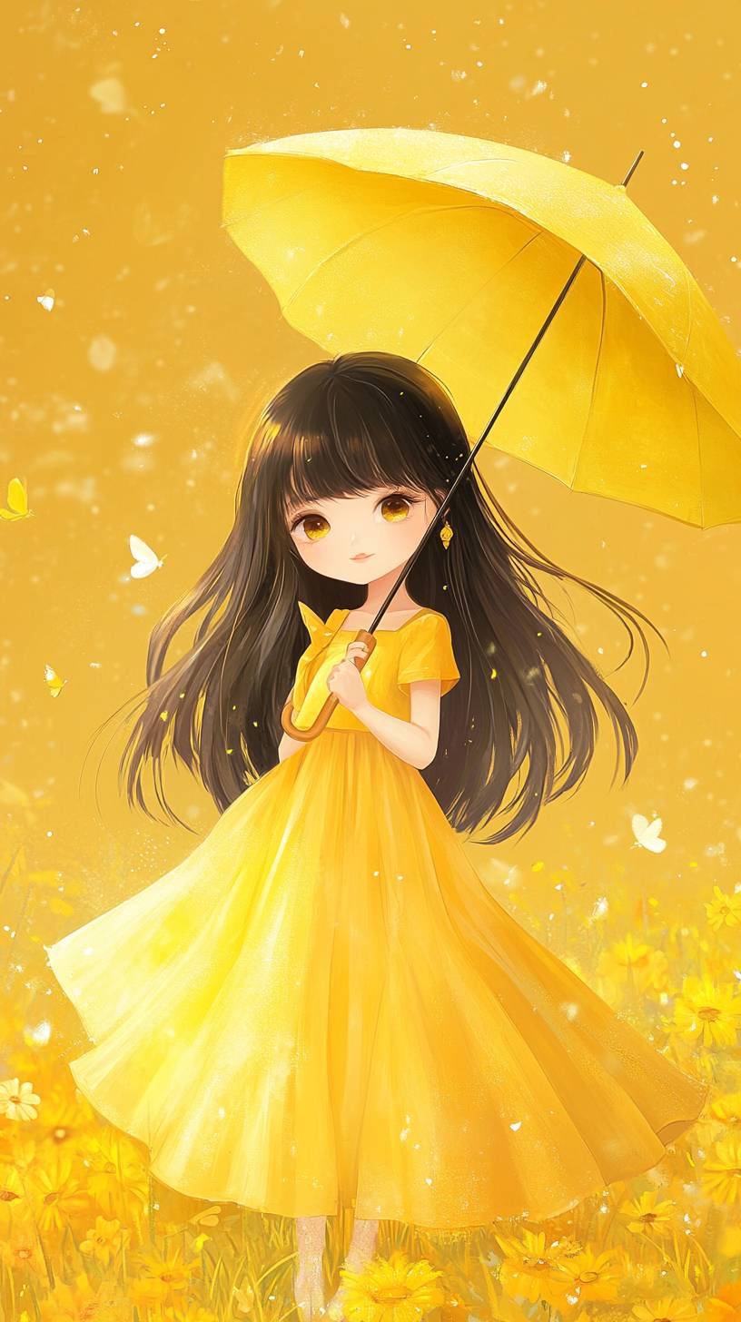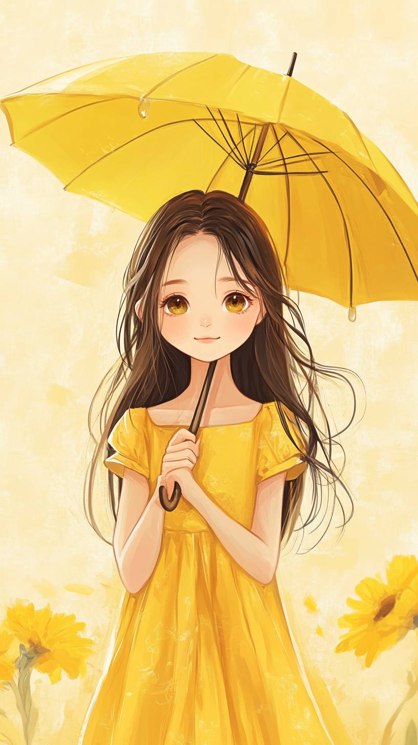 aesthetic yellow chibi long haired beautiful young girl wearing a long yellow frock,with a yellow umbrella,beautiful calm view,yellow background,minimalist,hyper detailed,--v 5 --ar 9:16 --v 6.1