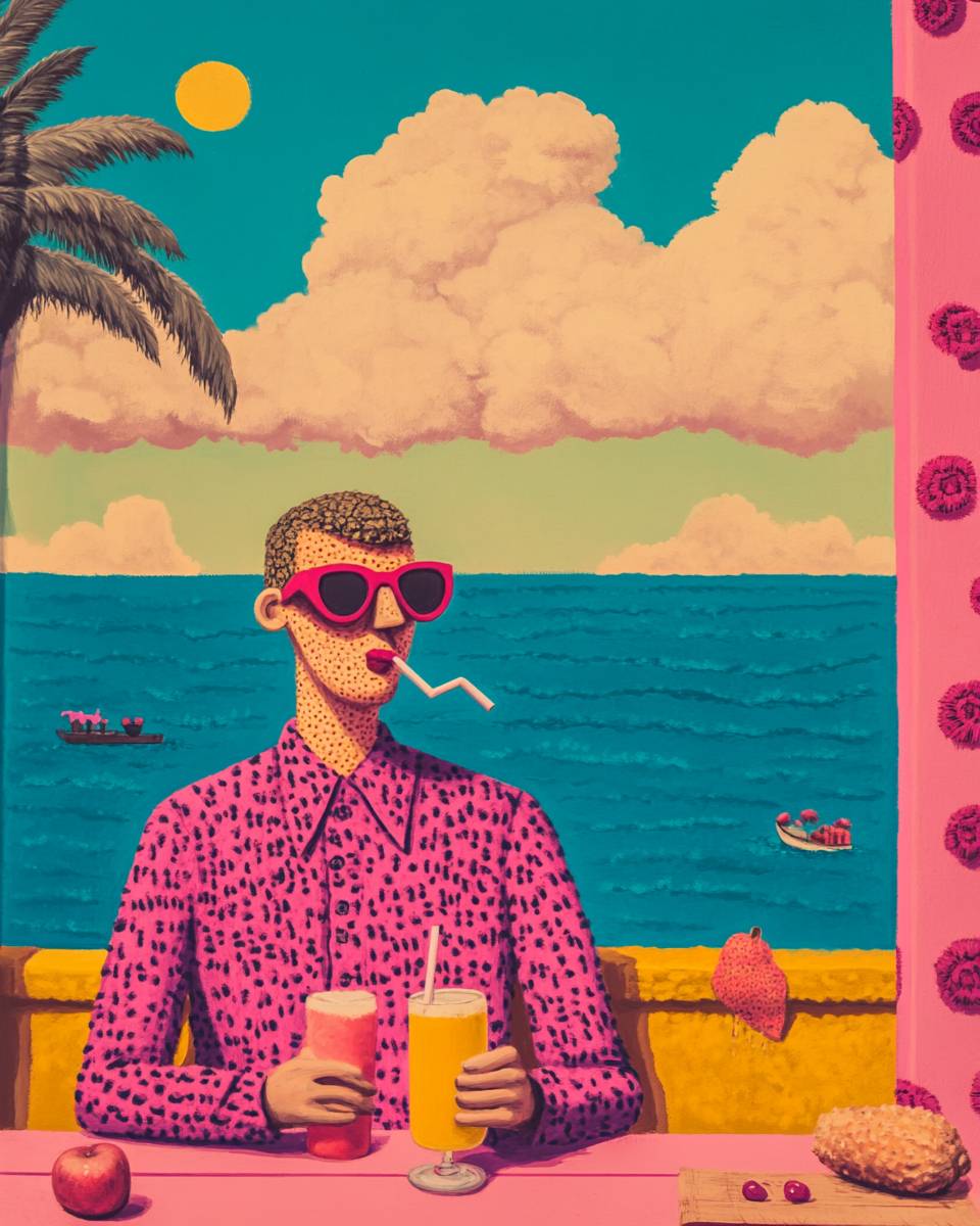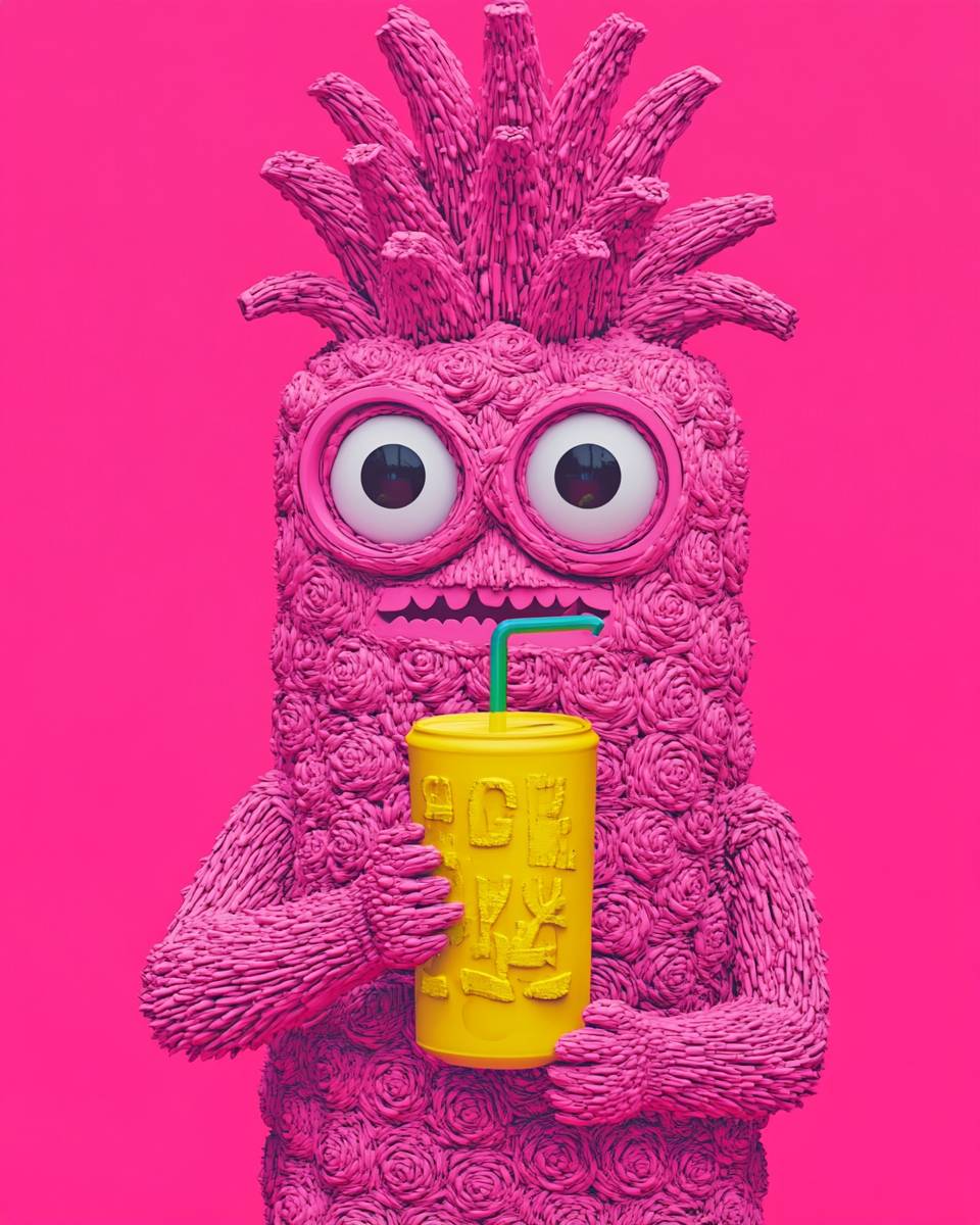 A whimsical pineapple bartender drinking fresh fruit juice.