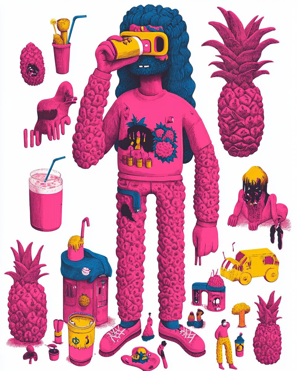 Whimsical pineapple bartender drinking fresh fruit juice. Drinking using a straw, line art, --chaos 5 --ar 4:5 --sref 2412802182 --personalize xe2h6kk --stylize 155 --v 6.1