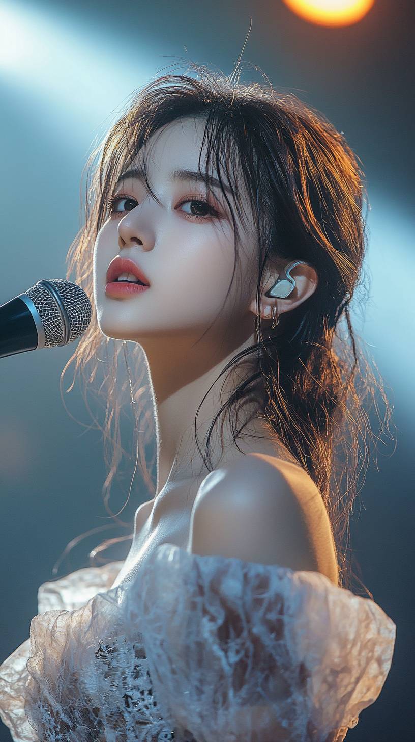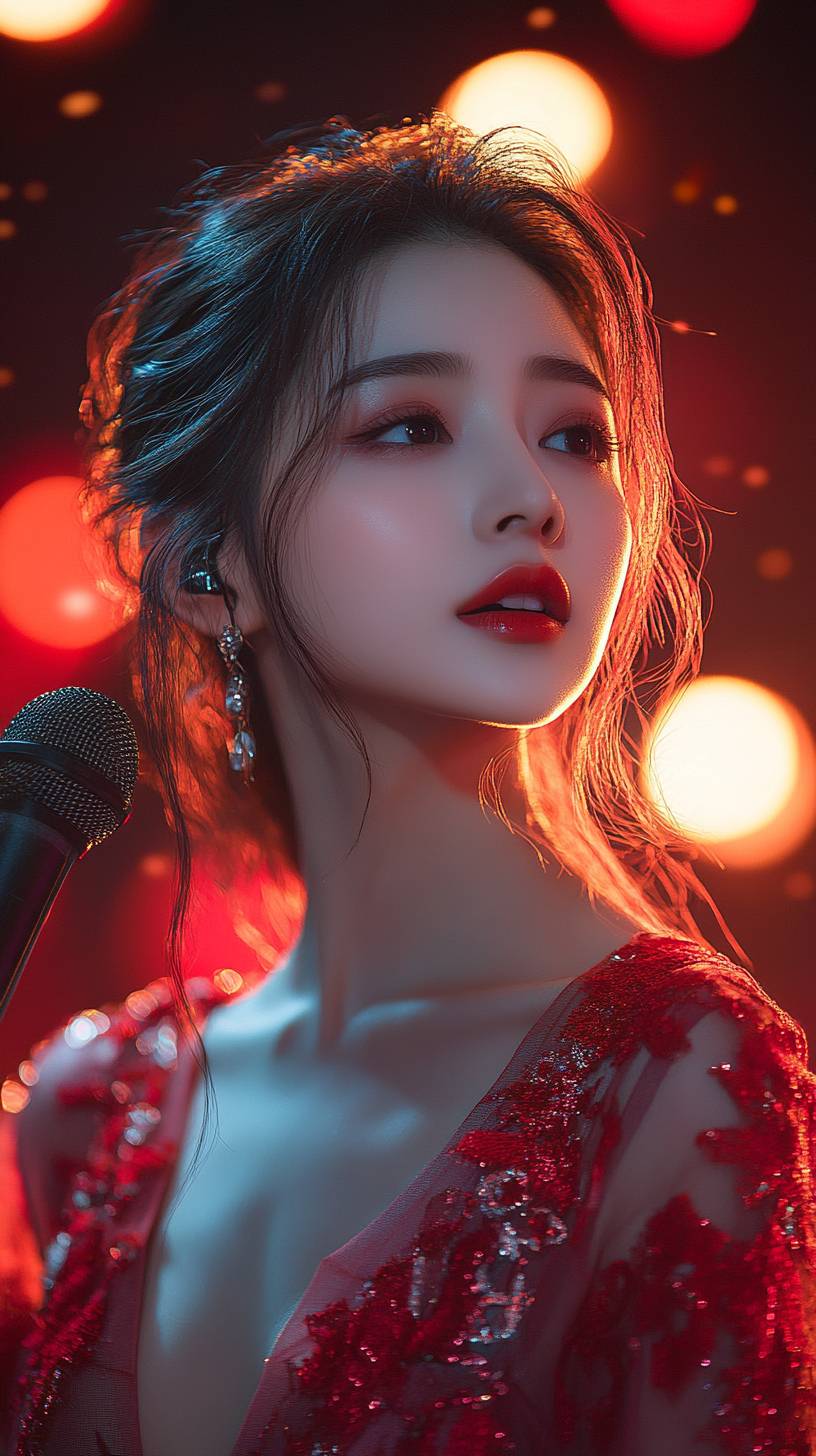 Chinese modern beautiful woman, 20 years old, young and beautiful fashion, exquisite face, fair skin, stage, lighting, bright picture, singing with microphone in hand, slender figure, front full body photo, live photography, high definition, long view, 16K.