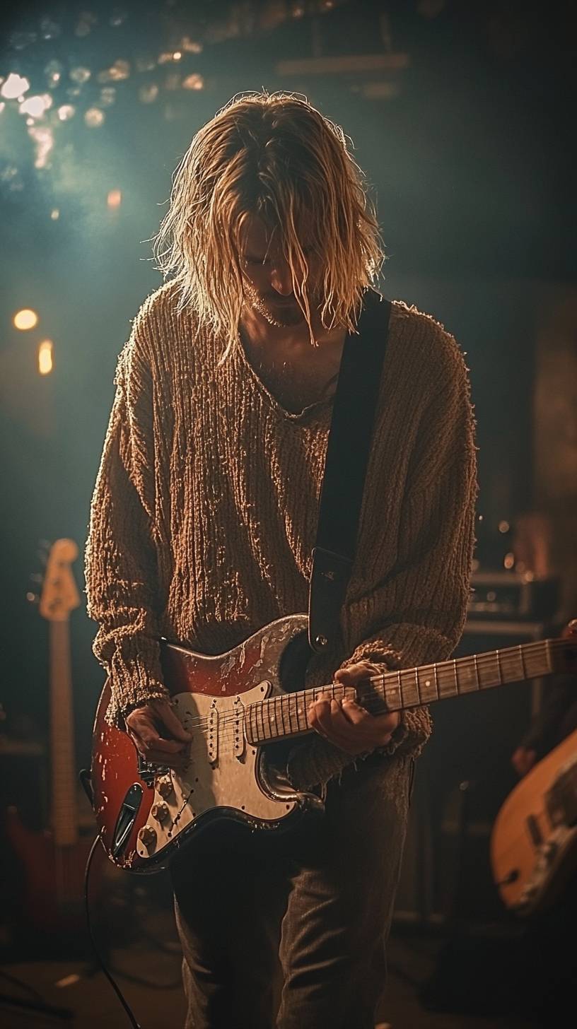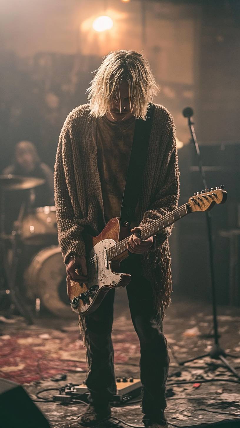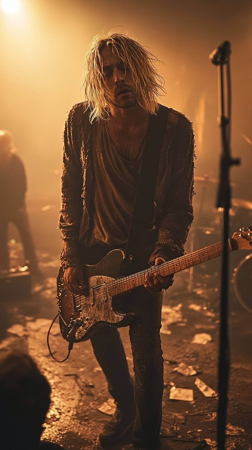 A screen grab of Kurt Cobain standing on a crumbling stage, we see his face. The dim, flickering lights of the venue cast an eerie glow over his disheveled blonde hair and haunted , slightly larger eyes. His tattered, oversized sweater hangs loosely on his thin frame, as he grips a guitar that seems almost too heavy for him to bear. The stage around him is littered with broken instruments and remnants of a forgotten era, while ghostly figures in the audience flicker in and out of existence, their mournful gazes locked onto Kurt’s sorrowful expression. --ar 9:16 --stylize 250 --v 6.1