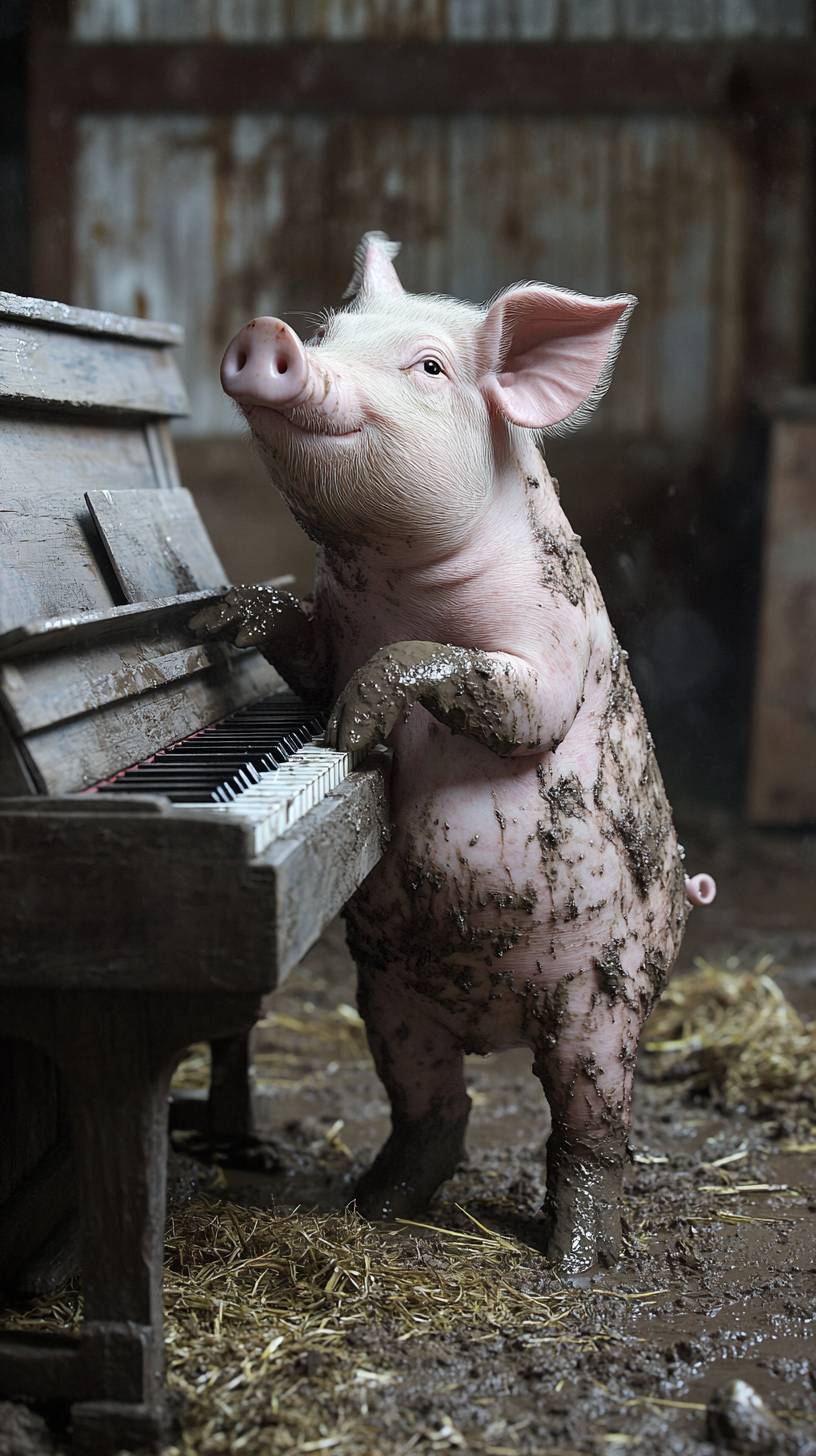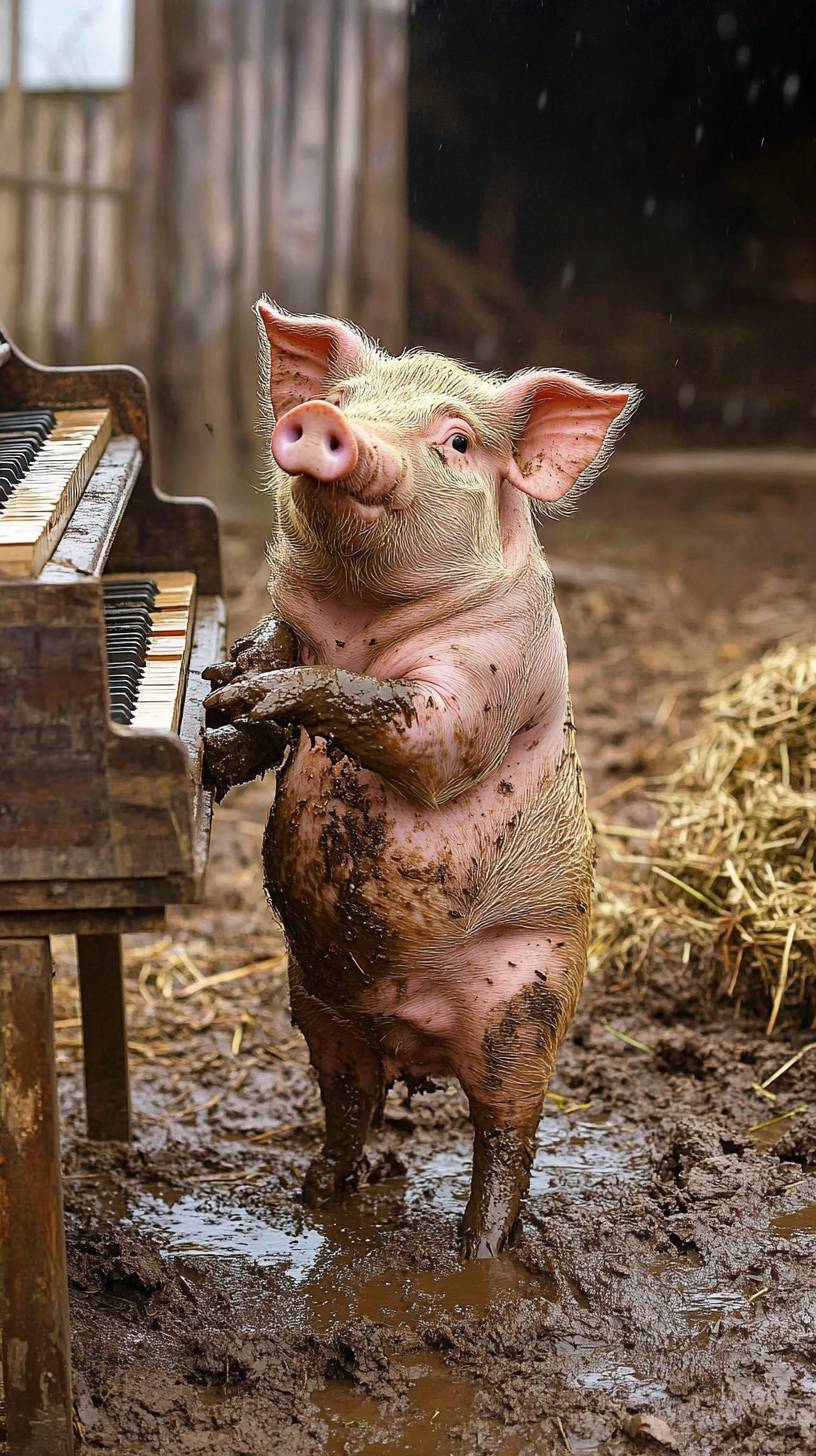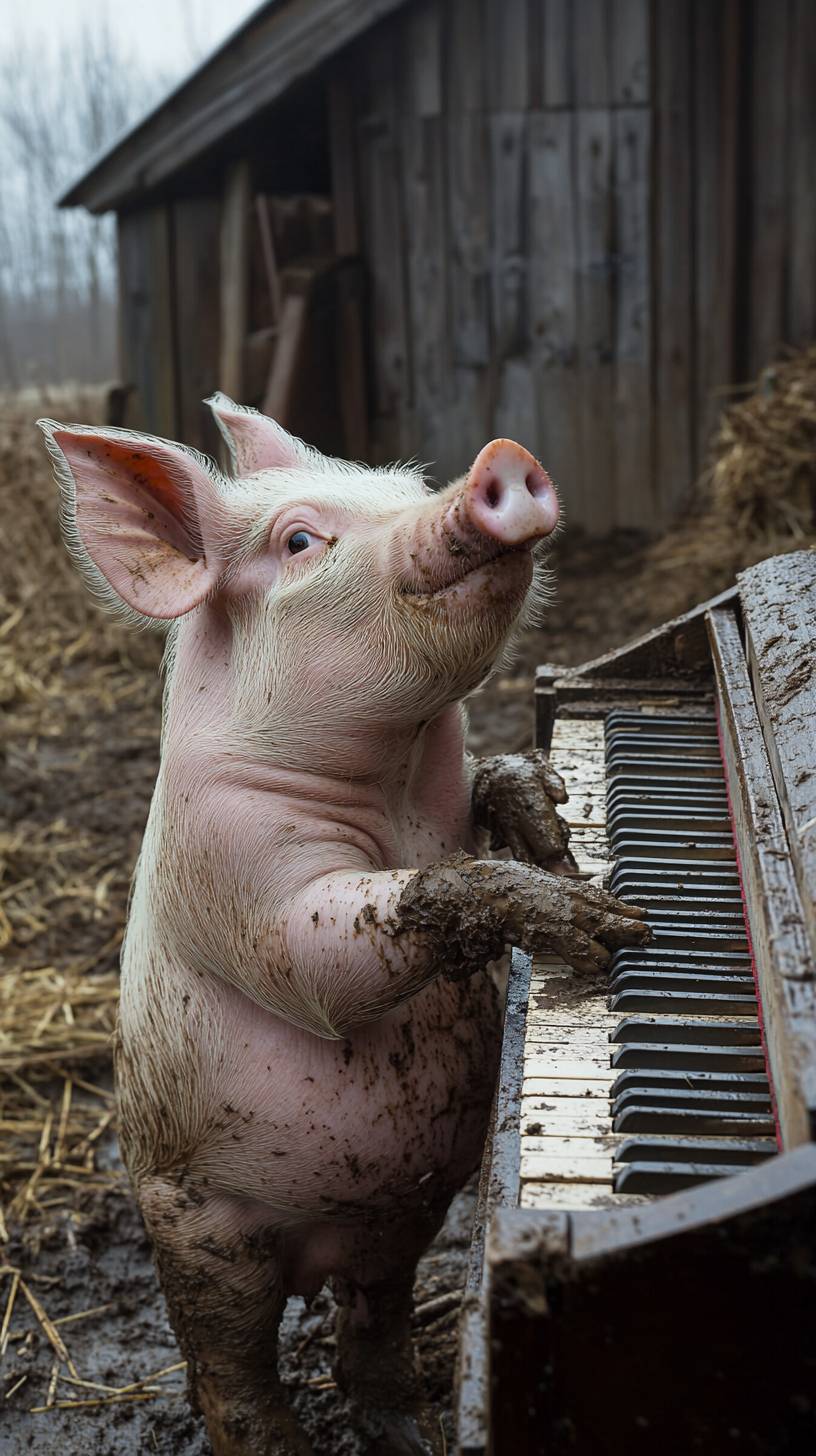 An ultra-realistic photograph of a pig standing upright on its hind legs, playing a piano. The pig is covered in mud and straw, with droplets of water still clinging to its rough fur. Its posture is heavy and natural, reflecting the true anatomy of the pig, with small, expressive eyes that reflect the light. The background is a muddy farmyard with a rustic wooden barn and scattered hay, captured under natural, diffused daylight. The overall scene is detailed and raw, with no exaggeration or stylization, capturing the essence of a real farm environment. --ar 9:16 --v 6.1