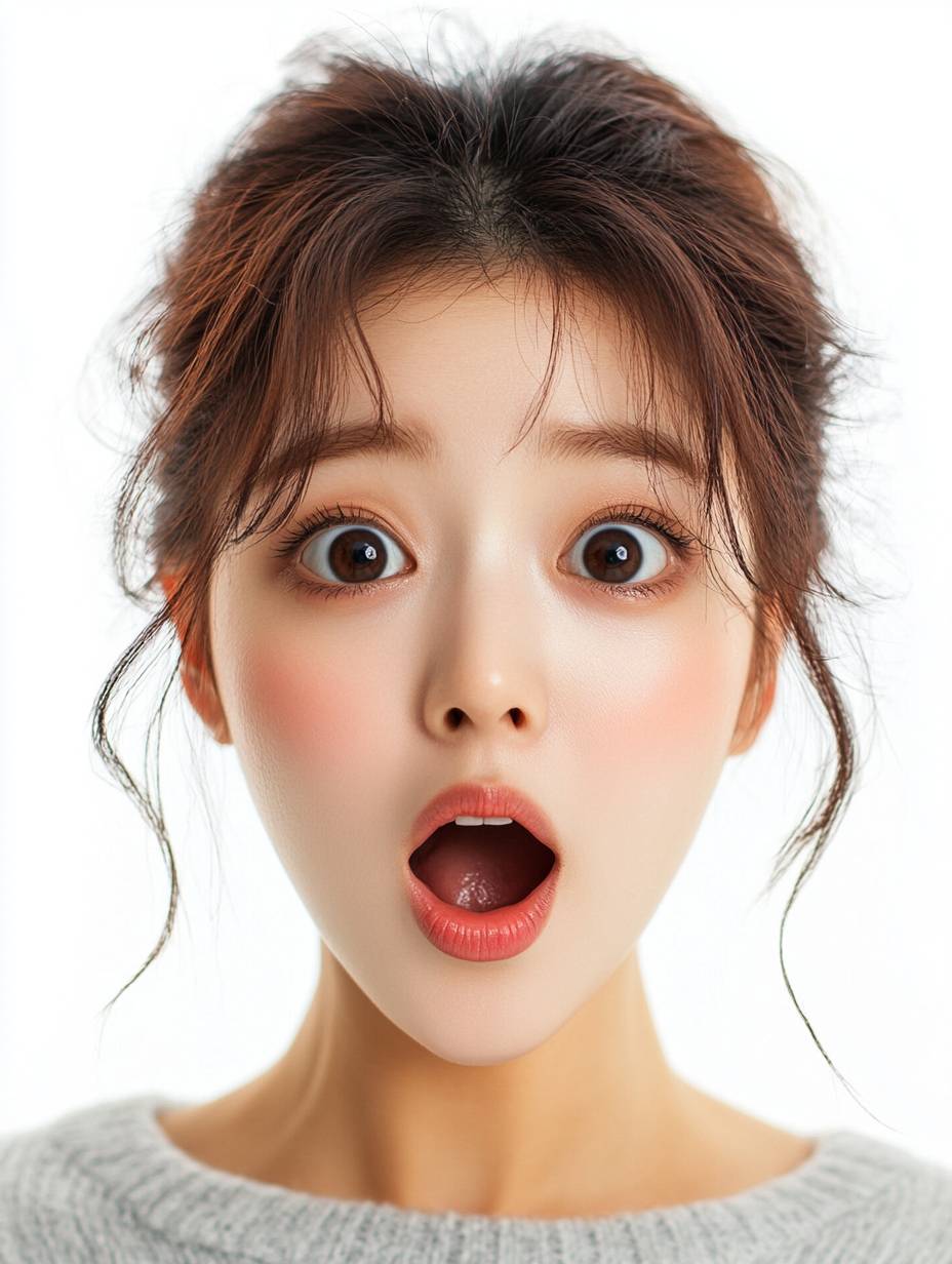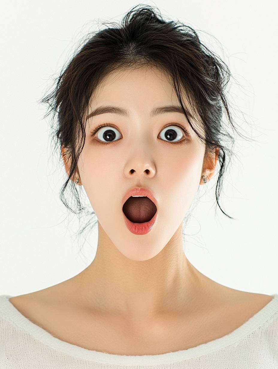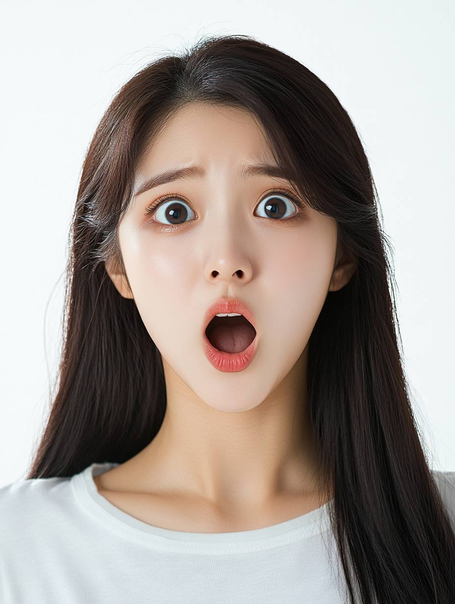 Create a highly realistic image of a very pretty 25-year-old Korean woman with an expression of surprise, her mouth open and her entire face fully visible. The background should be plain white to allow for easy background removal (nukki). The image should focus on her full facial expression, capturing her beauty and the genuine look of astonishment. Ensure that the image is lifelike, with detailed attention to her features and a clean, isolated background. --ar 3:4 --v 6.1