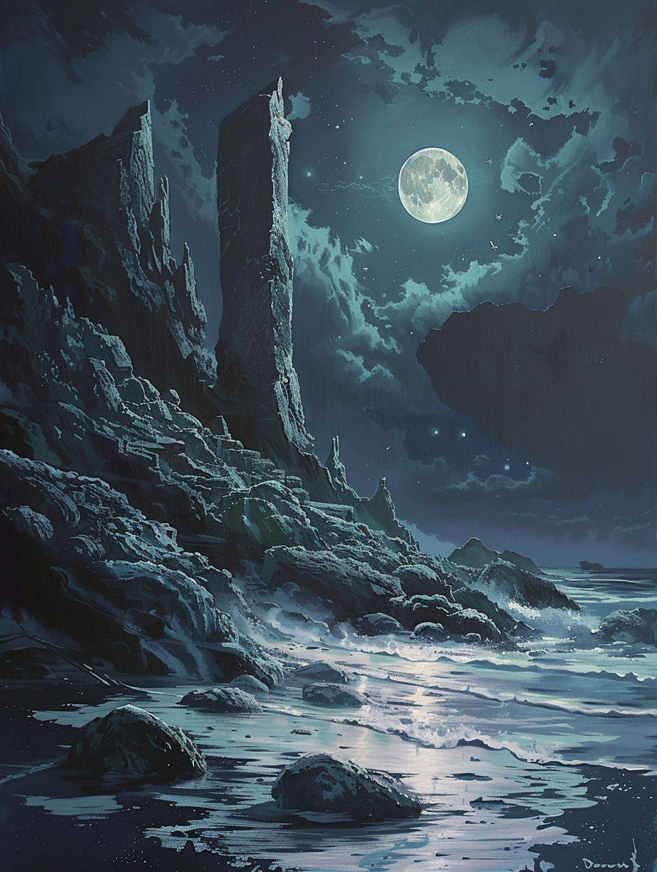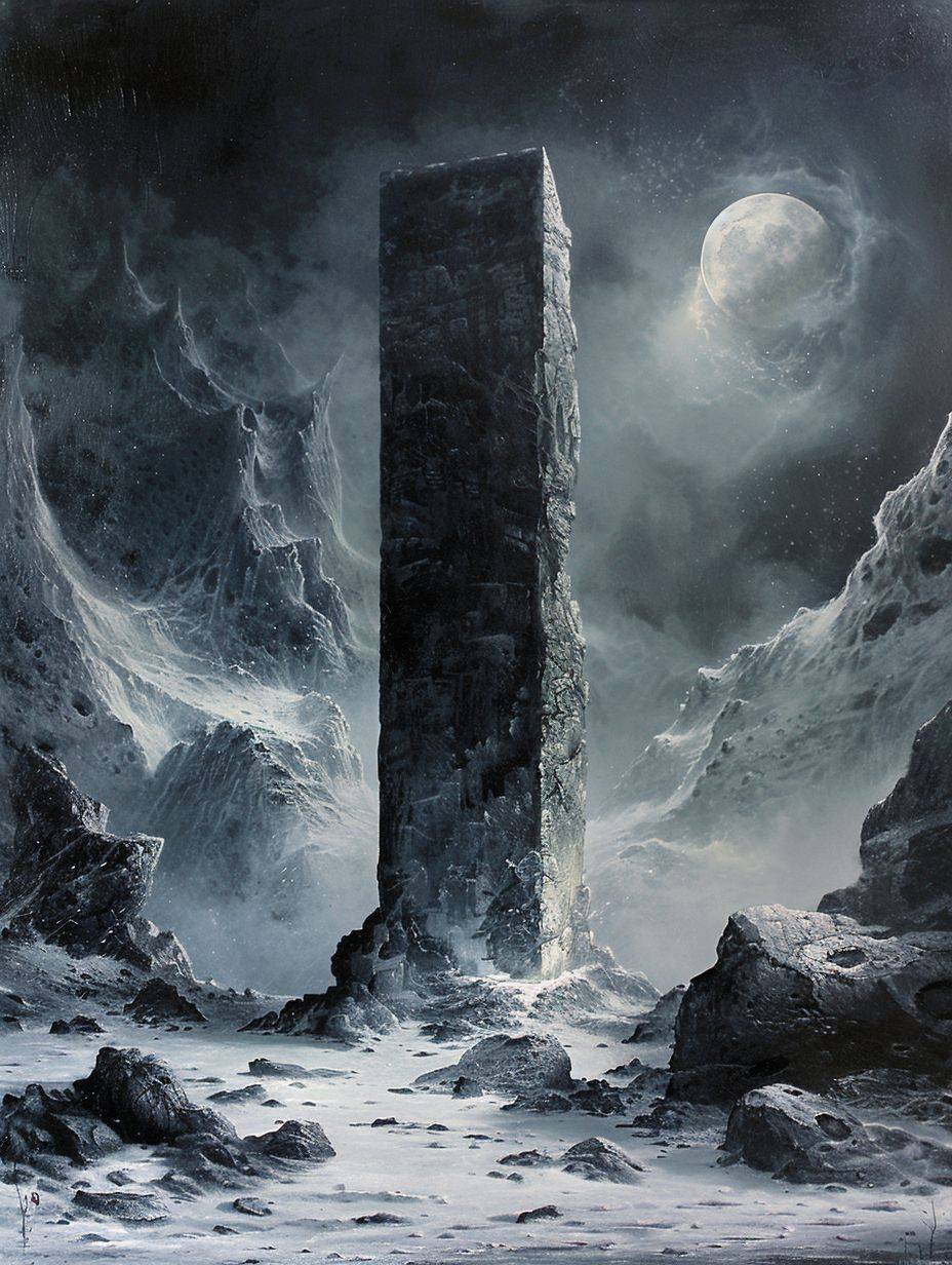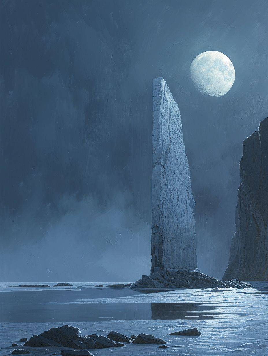 The mysterious monolith in 'Lunar Luminescence' is delicately traced by icy azure cool moonlight and slate gray, enhancing the serenity and stillness of the scene.