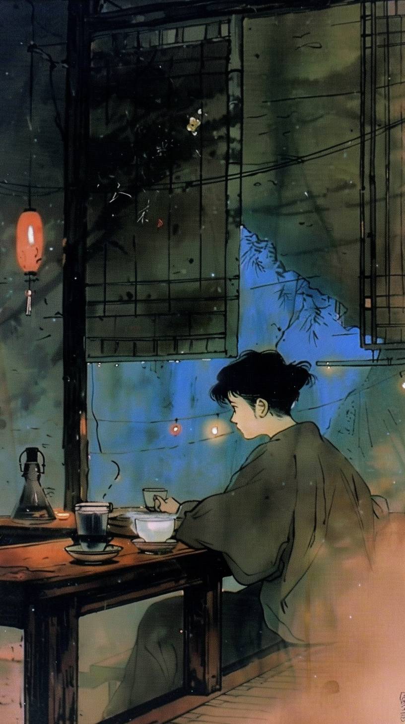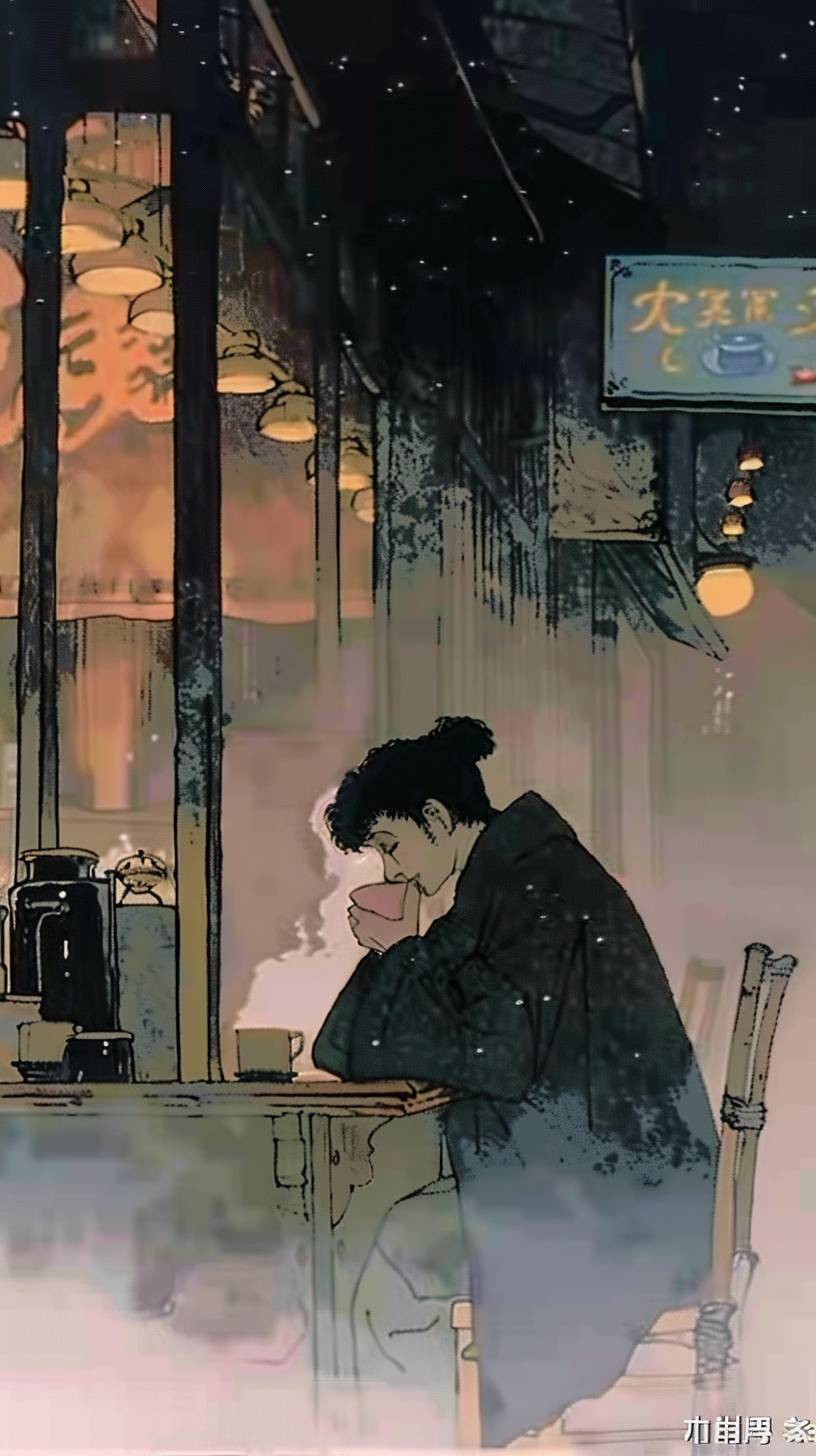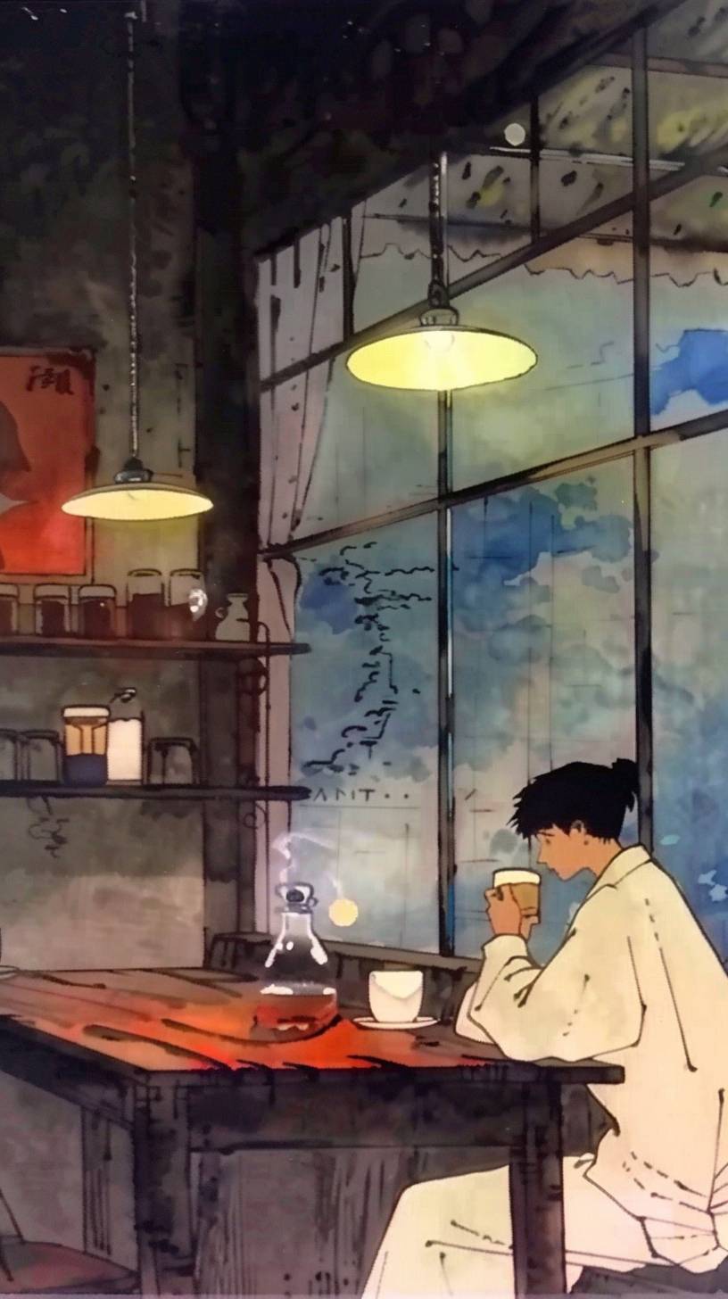 Kenta is enjoying a hot drink in a cozy café. --ar 9:16 --sref 102 --v 6.0