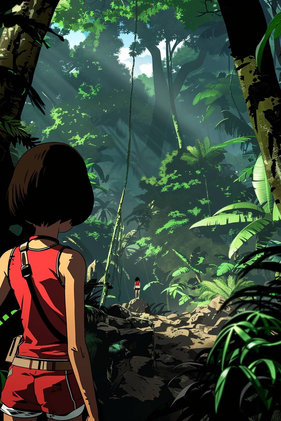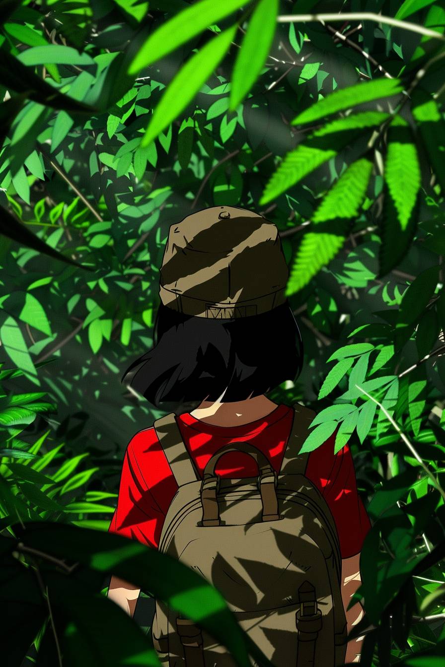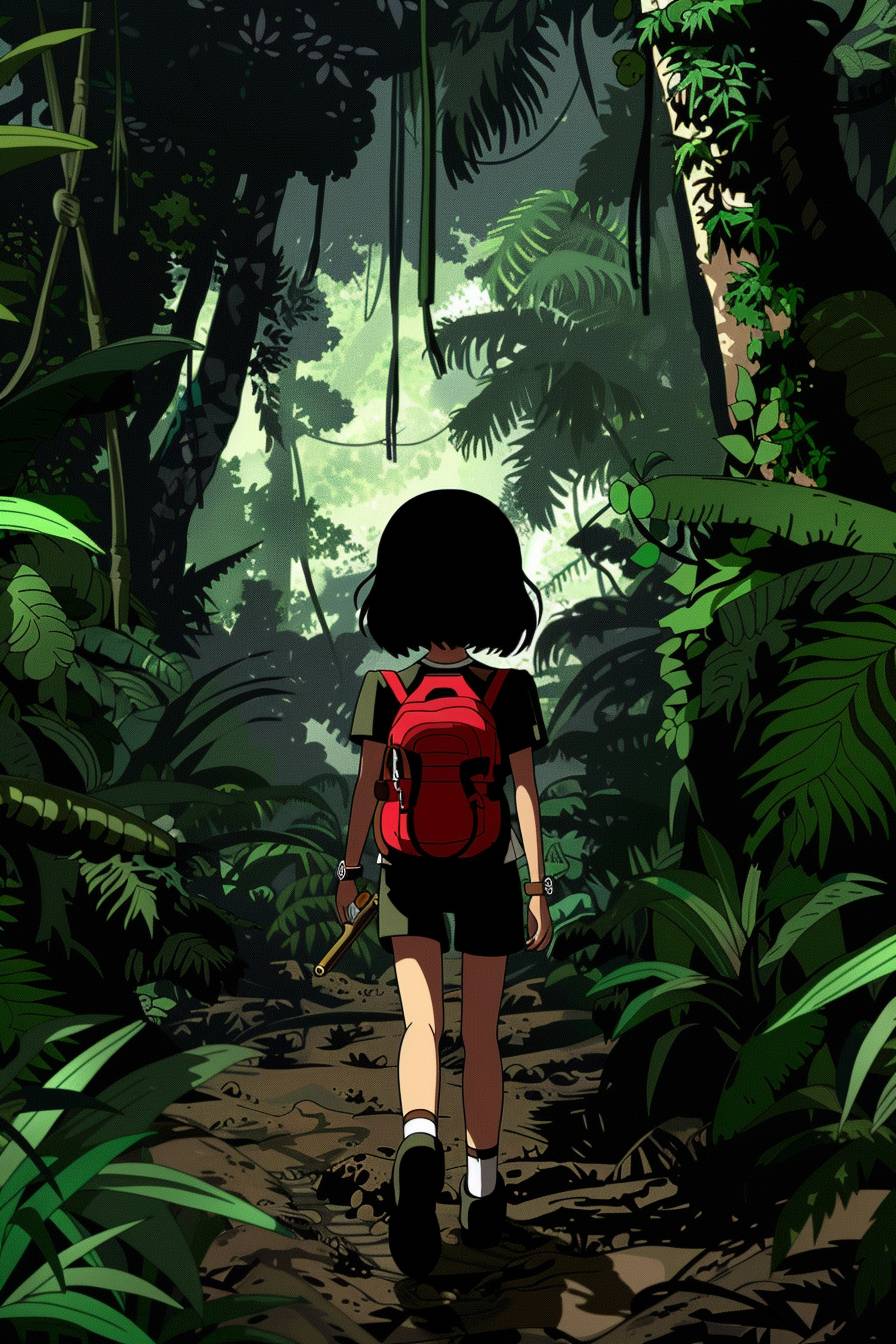Yui is exploring a dense jungle. --ar 2:3 --sref 107 --v 6.0