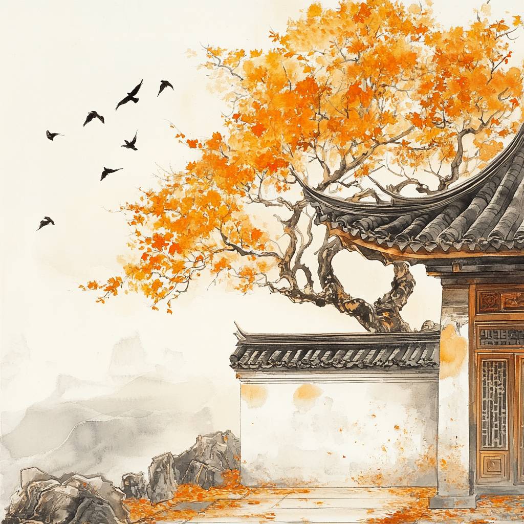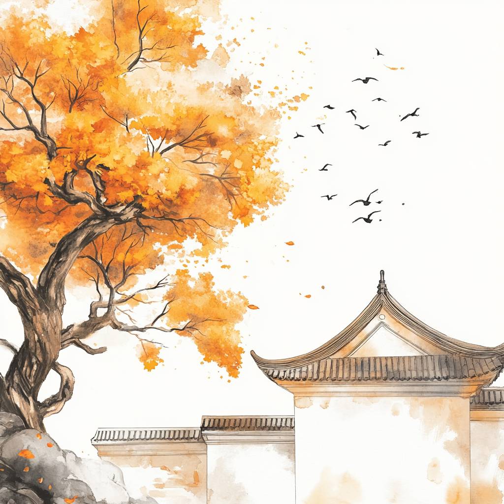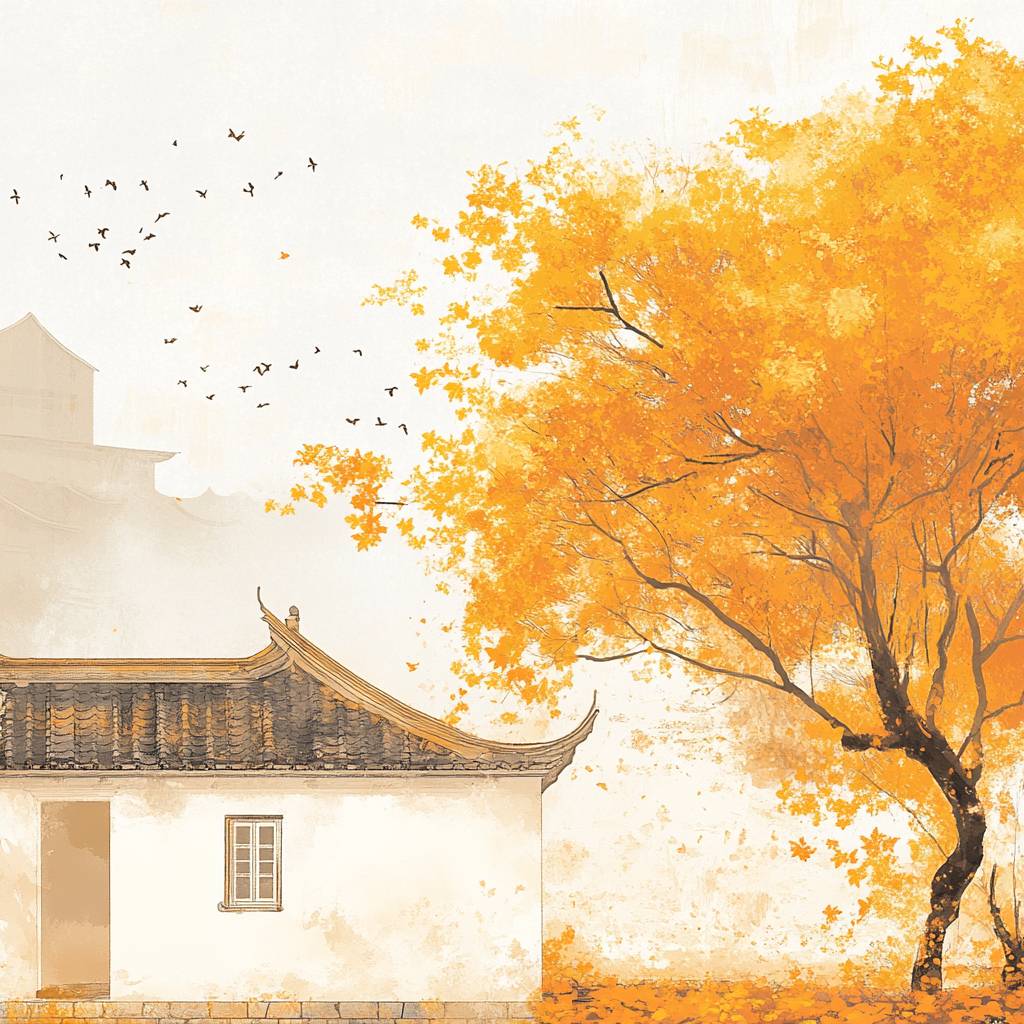 A golden maple tree next to an ancient building's white wall, with birds and an orange Chinese ink painting style.