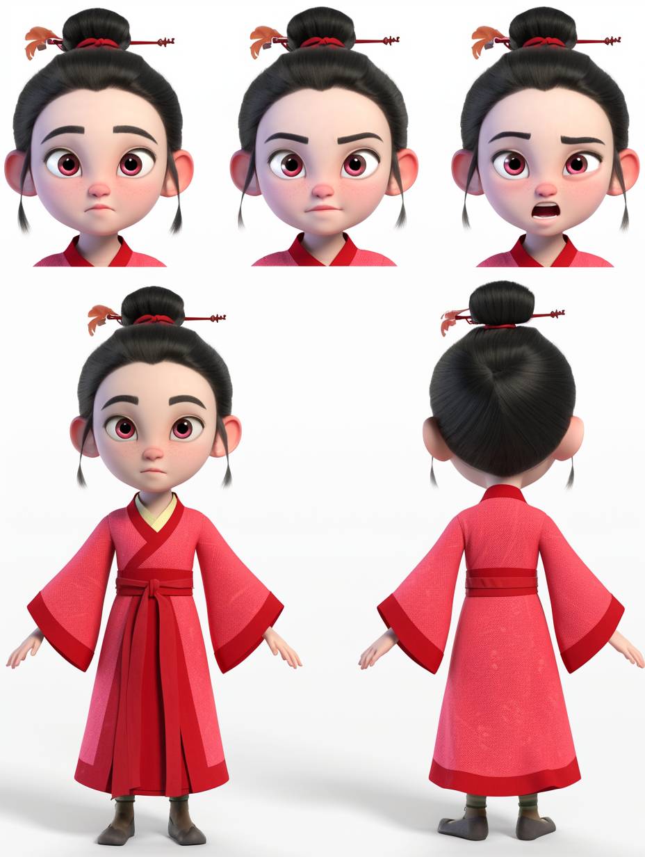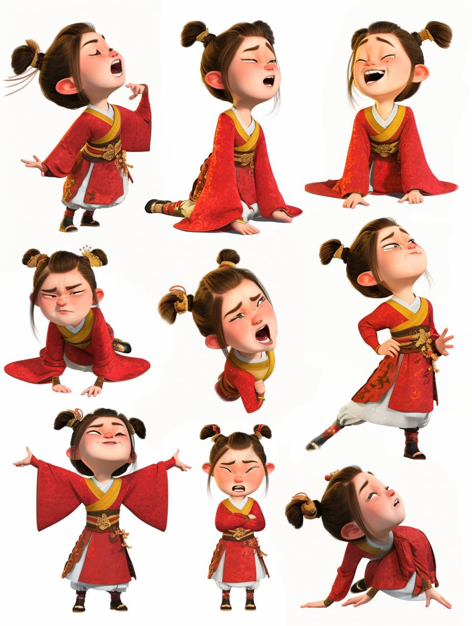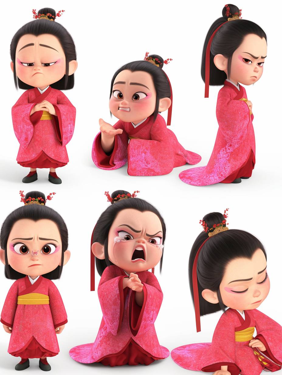 A five-year-old Tang girl in Hanfu showing various emotions, Pixar style.